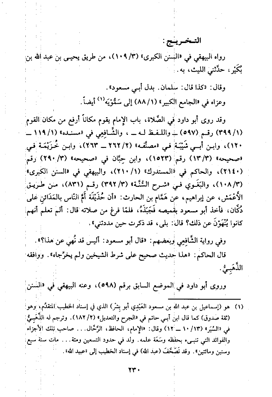 وقد روى أبو داود في الصَّلاة، باب الإمام يقوم مكانًا أرفع من مكان القوم (١/ ٣٩٩) رقم (٥٩٧) -واللفظ له-، والشَّافِعِي في مسنده (١/ ١٩٩ - ١٢٠)، وابن أبي شَيْبَة في "مصنَّفه" (٢/ ٢٦٢ - ٢٦٣)، وابن خُزَيْمَة في "صحيحه" (٣/ ١٣) رقم (١٥٢٣)، وابن حِبَّان في "صحيحه" (٣/ ٢٩٠) رقم (٢١٤٠) والحاكم في "المستدرك" (١/ ٢١٠)، والبيهقي في "السنن الكبرى" (٣/ ١٠٨)، والبَغَوي في "شرح السُّنَّة" (٣/ ٣٩٢) رقم (٨٣١)، من طريق الأَعْمَش، عن إبراهيم، عن هَمَّام بن الحارث: "أن حُذَيْفَة أَمَّ النَّاس بالمَدَائنِ على دُكَّان، فأخذ أبو مسعود بقميصه فَجَبْذَهُ، فلمَّا فرغ من صلاته قال: ألم تعلم أنهم كانوا يُنْهَوْنَ عن ذلك؟ قال: بلى، قد ذكرت حين مددتني".