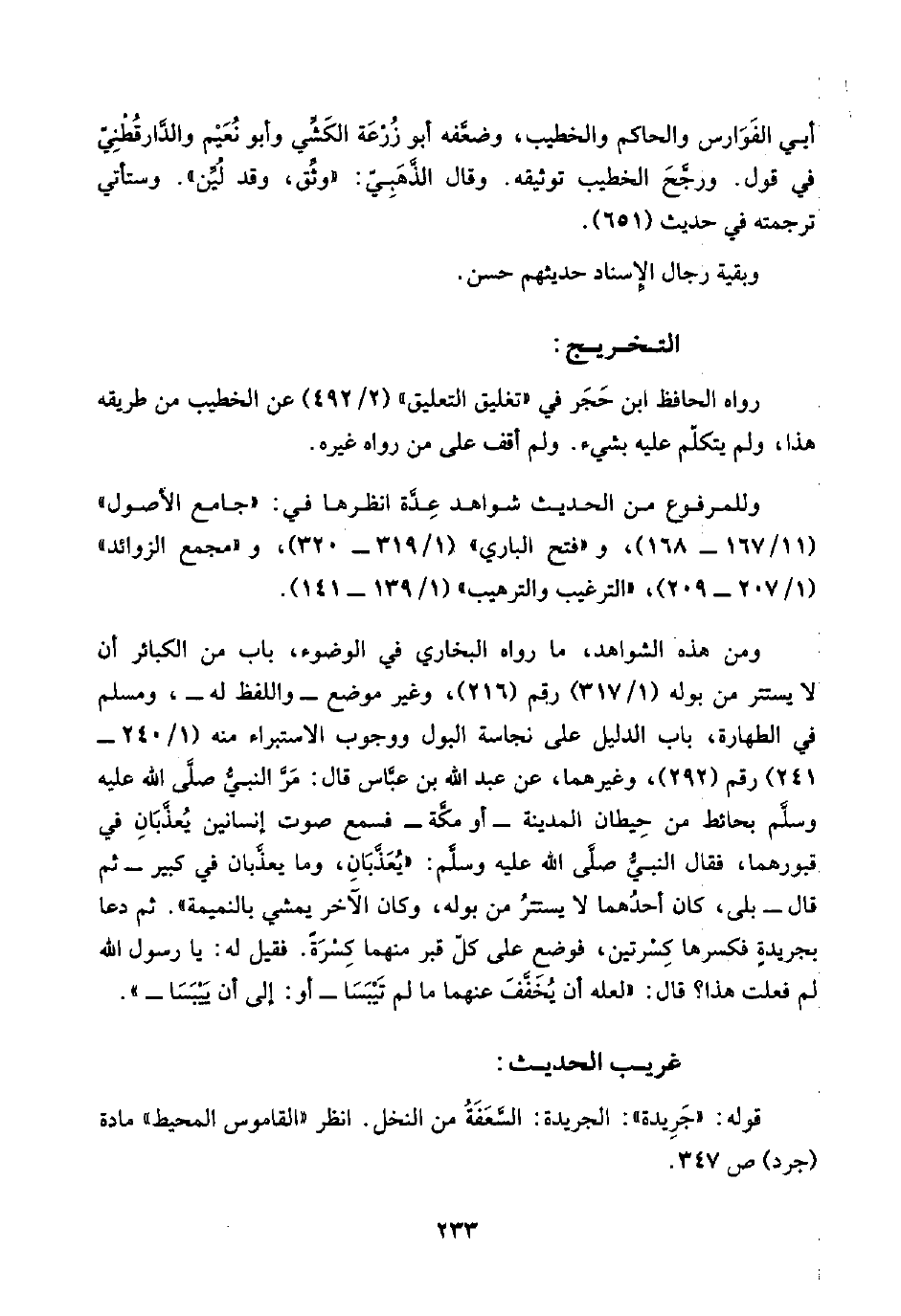 ومن هذه الشواهد، ما رواه البخاري في الوضوء، باب من الكبائر أن لا يستتر من بوله (١/ ٣١٧) رقم (٢١٦)، وغير موضع -واللفظ له-، ومسلم في الطَّهارة، باب الدليل على نجاسة البول ووجوب الاستبراء منه (١/ ٢٤٠ - ٢٤١) رقم (٢٩٢)، وغيرهما، عن عبد اللَّه بن عبَّاس قال: مَرَّ النبيُّ صلَّى اللَّه عليه وسلَّم بحائط من حِيطان المدينة -أو مكَّة- فسمع صوت إنسانين يُعذَّبَانِ في قبورهما، فقال النبيُّ صلَّى اللَّه عليه وسلَّم: "يُعذَّبَانِ، وما يُعذَّبَانِ في كبير -ثم قال- بلي، كان أحدُهما لا يستترُ من بوله، وكان الآخر يمشي بالنميمة". ثم دعا بجريدةٍ فكسرها كِسْرتين، فوضع على كلّ قبر منهما كِسْرَةً. فقيل له: يا رسول اللَّه لم فعلت هذا؟ قال: "لعله أن يُخَفَّفَ عنهما ما لم تَيْبَسَا -أو: إلى أن يَيْبَسَا-".