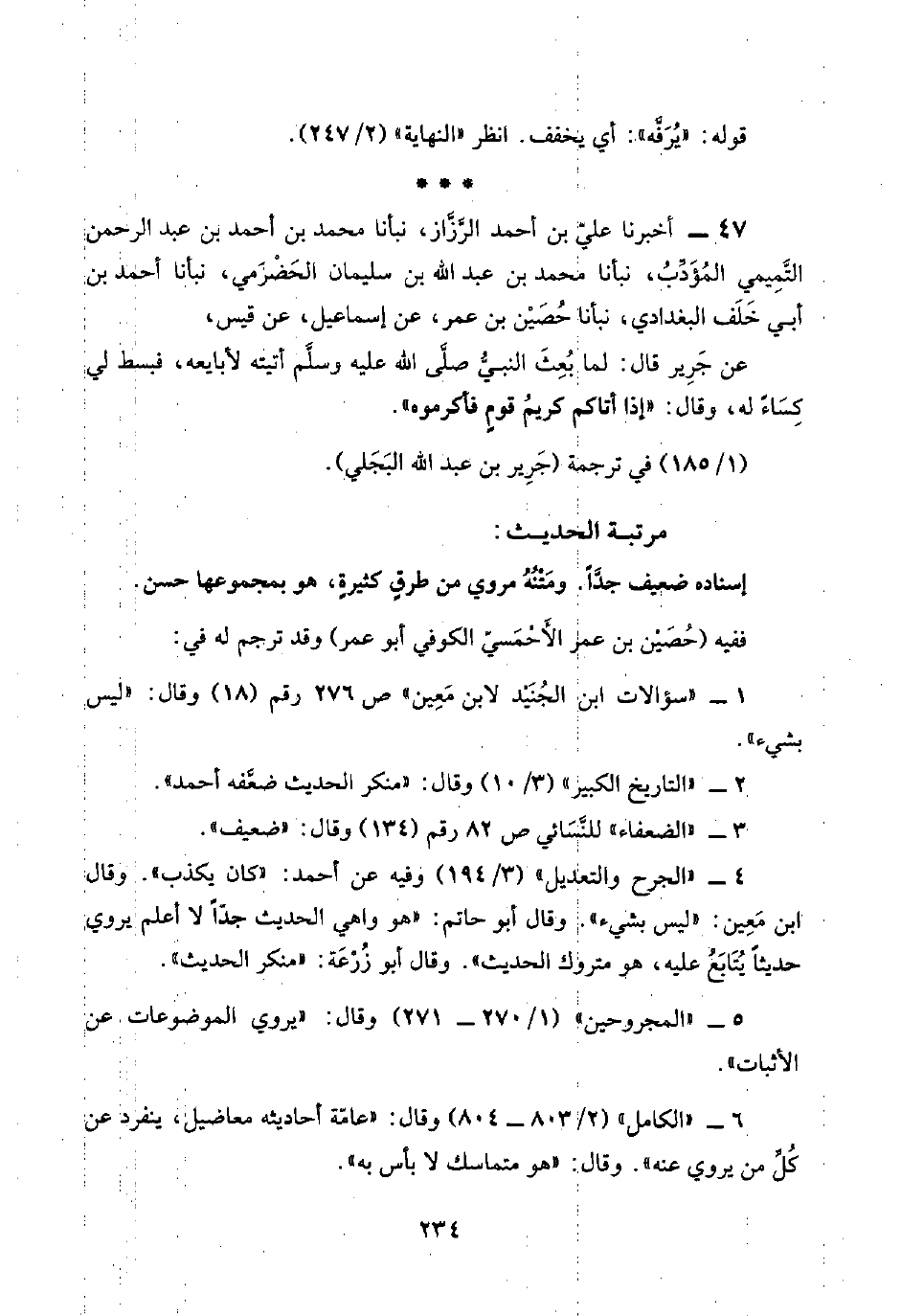 ٤٧ - أخبرنا عليّ بن أحمد الرَّزَّاز، نبأنا محمد بن أحمد بن عبد الرحمن التَّمِيمي المُؤَدِّبُ، نبأنا محمد بن عبد اللَّه بن سليمان الحَضْرَمي، نبأنا أحمد بن أبي خَلف البغدادي، نبأنا حُصَيْن بن عمر، عن إسماعيل، عن قيس،