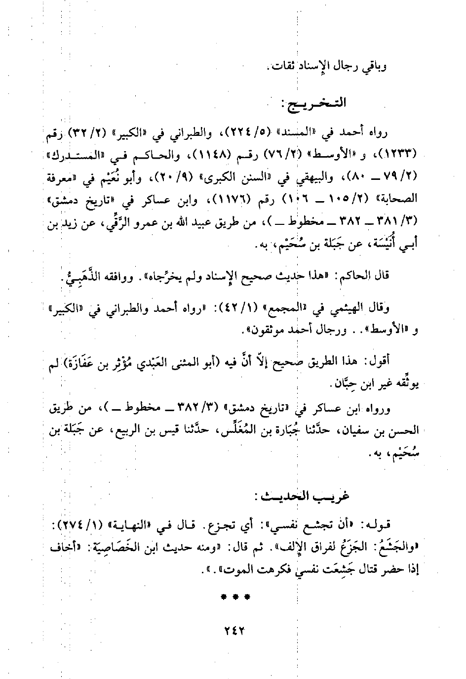 رواه أحمد في "المسند" (٥/ ٢٢٤)، والطبراني في "الكبير" (٢/ ٣٢) رقم (١٢٣٣)، و"الأوسط" (٢/ ٧٦) رقم (١١٤٨)، والحاكم في "المستدرك" (٢/ ٧٩ - ٨٠)، والبيهقي في "السنن الكبرى" (٩/ ٢٠)، وأبو نُعَيْم في "معرفة الصحابة" (٢/ ١٠٥ - ١٠٦) رقم (١١٧٦)، وابن عساكر في "تاريخ دمشق" (٣/ ٣٨١ - ٣٨٢ - مخطوط-)، من طريق عبيد اللَّه بن عمرو الرَّقِّي، عن زيد بن أبي أُنَيْسَة، عن جَبَلة بن سُحَيْم، به.
