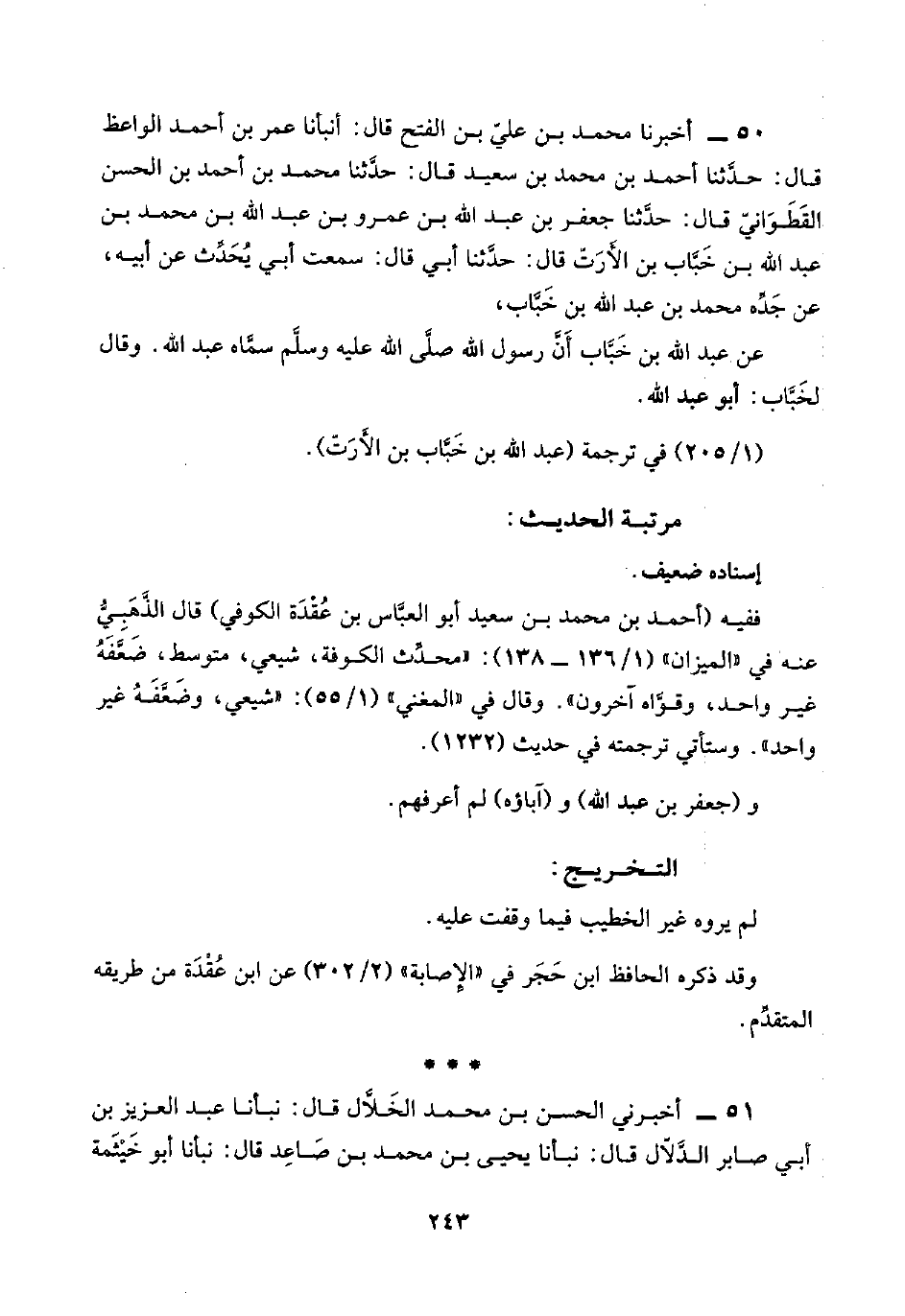 ففيه (أحمد بن محمد بن سعيد أبو العبَّاس بن عُقْدَة الكوفي) قال الذَّهَبِيُّ عنه في "الميزان" (١/ ١٣٦ - ١٣٨): "محدِّث الكوفة، شيعي، متوسط، ضَعَّفَهُ غير واحد، وقوَّاه آخرون". وقال في "المغني" (١/ ٥٥): شيعي، وضَعَّفَهُ غير واحد". وستأتي ترجمته في حديث (١٢٣٢).