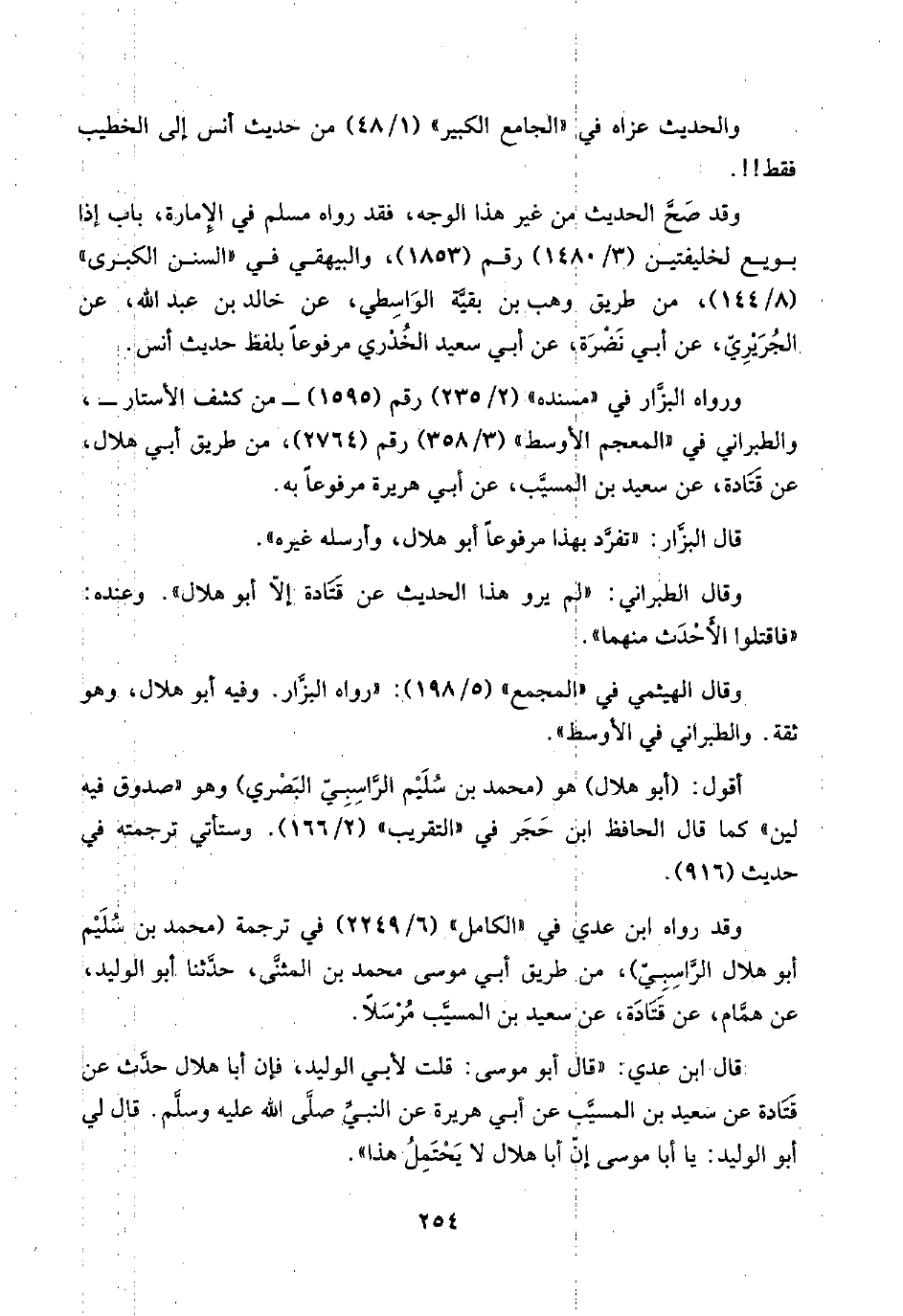 قال ابن عدي: "قال أبو موسى: قلت لأبي الوليد، فإن أبا هلال حدَّث عن قَتَادة عن سعيد بن المسيَّب عن أبي هريرة عن النبيِّ صلَّى اللَّه عليه وسلَّم. قال لي أبو الوليد: يا أبا موسى إنّ أبا هلال لا يَحْتَمِلُ هذا".