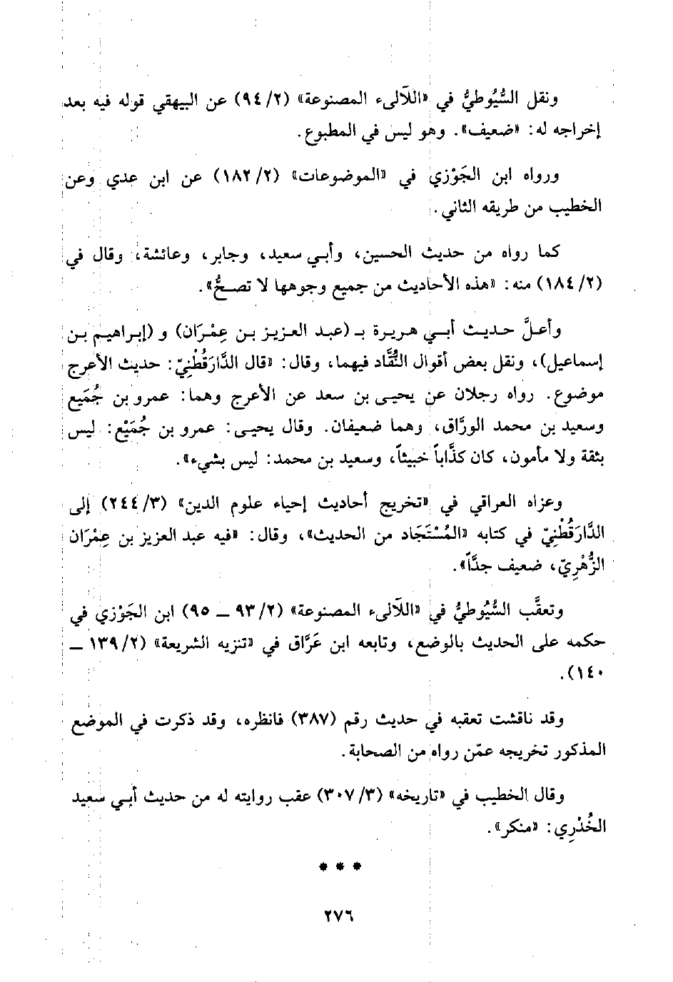 وأعلَّ حديث أبي هريرة بـ (عبد العزيز بن عِمْرَان) و (إبراهيم بن إسماعيل)، ونقل بعض أقوال النُّقَّاد فيهما، وقال: "قال الدَّارَقُطْنِيّ: حديث الأعرج موضوع. رواه رجلان عن يحيى بن سعد عن الأعرج وهما: عمرو بن جُمَيع وسعيد بن محمد الورَّاق، وهما ضعيفان. وقال يحيى: عمرو بن جُمَيْع: ليس بثقة ولا مأمون، كان كذَّابًا خبيثًا، وسعيد بن محمد: ليس بشيء".