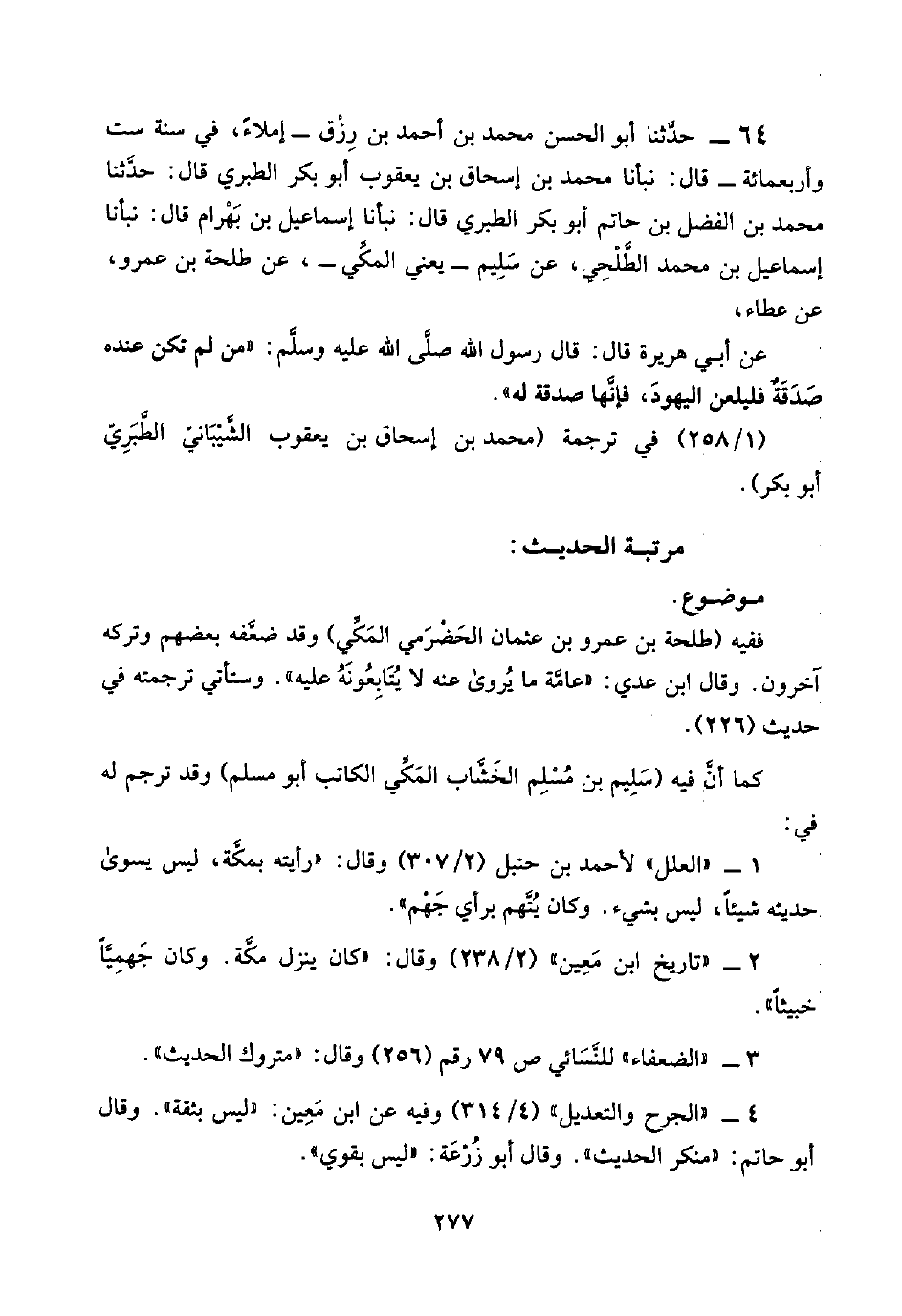 ٦٤ - حدَّثنا أبو الحسن محمد بن أحمد بن رِزْق -إملاءً، في سنة ست وأربعمائة- قال: نبأنا محمد بن إسحاق بن يعقوب أبو بكر الطبري قال: حدَّثنا محمد بن الفضل بن حاتم أبو بكر الطبري قال: نبأنا إسماعيل بن بَهْرام قال: نبأنا إسماعيل بن محمد الطَّلْحِي، عن سَلِيم -يعني المكِّي-، عن طلحة بن عمرو، عن عطاء،