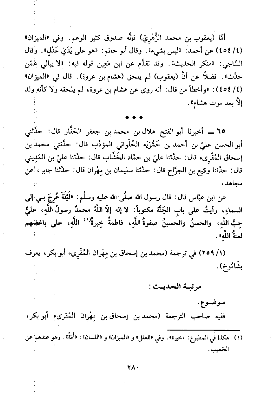 أمَّا (يعقوب بن محمد الزُّهْرِيّ) فإنَّه صدوق كثير الوهم. وفي "الميزان" (٤/ ٤٥٤) عن أحمد: "ليس بشيء". وقال أبو حاتم: "هو على يَدَيْ عَدْلٍ". وقال السَّاجي: "منكر الحديث". وقد تقدَّم عن ابن مَعِين قوله فيه: "لا يبالي عمّن حدَّث". فضلًا عن أنَّ (يعقوب) لم يلحق (هشام بن عروة). قال في "الميزان" (٤/ ٤٥٤): "وأخطأ من قال: أنه روي عن هشام بن عروة، لم يلحقه ولا كأنه ولد إلَّا بعد موت هشام".