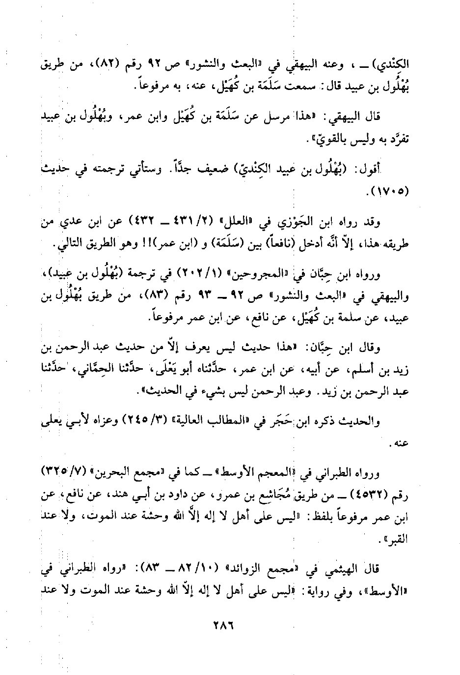 ورواه ابن حِبَّان في "المجروحين" (١/ ٢٠٢) في ترجمة (بُهْلُول بن عبيد)، والبيهقي في "البعث والنشور" ص ٩٢ - ٩٣ رقم (٨٣)، من طريق بُهْلُول بن عبيد، عن سلمة بن كُهَيْل، عن نافع، عن ابن عمر مرفوعًا.