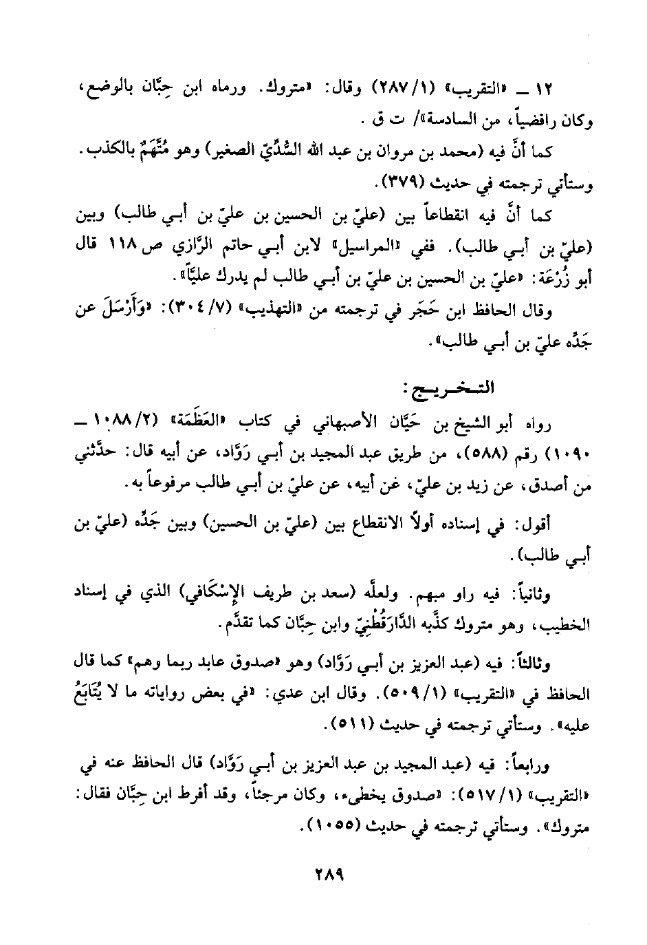 كما أنَّ فيه انقطاعًا بين (عليّ بن الحسين بن عليّ بن أبي طالب) وبين (عليّ بن أبي طالب). ففي "المراسيل" لابن أبي حاتم الرَّازي ص ١١٨ قال أبو زُرْعَة: "عليّ بن الحسين بن عليّ بن أبي طالب لم يدرك عليًّا".