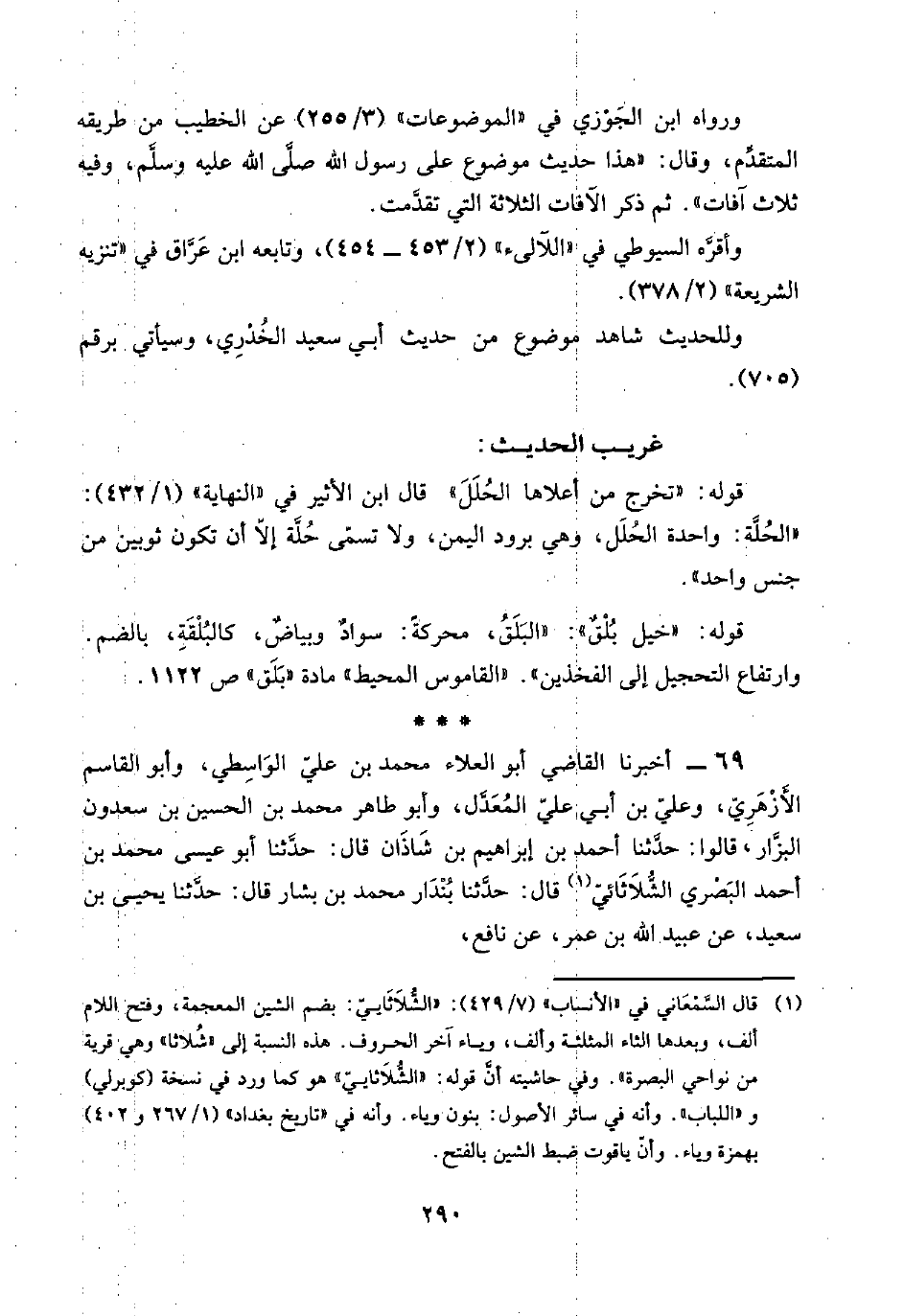 (¬١) قال السَّمْعَاني في "الأنساب" (٧/ ٤٢٩): "الشُّلَاثَاييّ: بضم الشين المعجمة، وفتح اللام ألف، وبعدها الثاء المثلثة وألف، وياء آخر الحروف. هذه النسبة إلى "شُلاثا" وهي قرية من نواحي البصرة". وفي حاشيته أنَّ قوله: "الشُّلَاثاييّ" هو كما ورد في نسخة (كوبرلي) و"اللباب". وأنه في سائر الأصول: بنون وياء، وأنه في "تاريخ بغداد" (١/ ٢٦٧ و ٤٠٢) بهمزة وياء. وأنّ ياقوت ضبط الشين بالفتح.