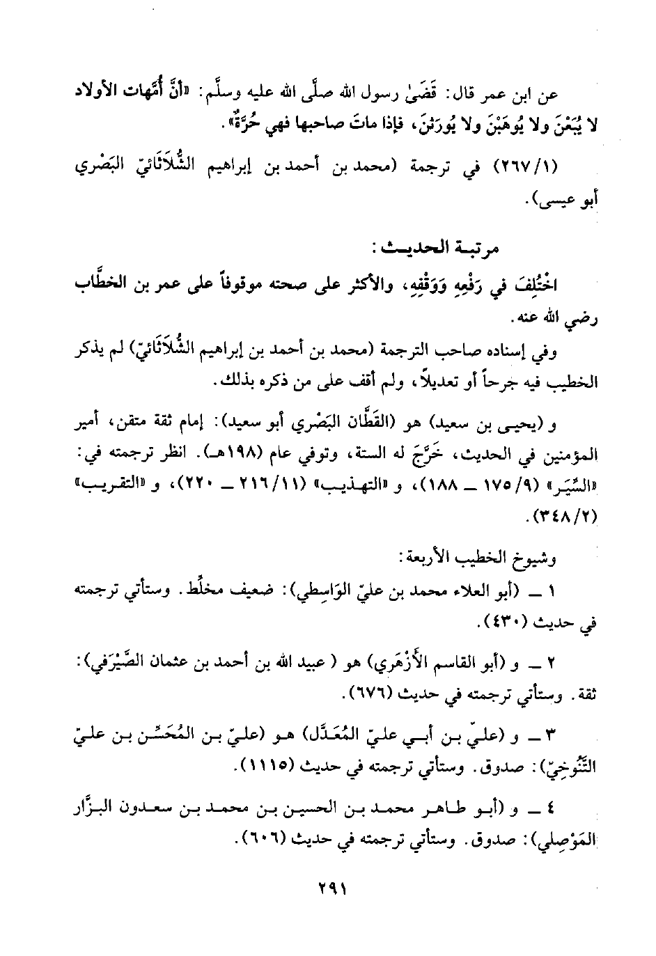 عن ابن عمر قال: قَضَى رسول اللَّه صلَّى اللَّه عليه وسلَّم: "أنَّ أُمَّهات الأولاد لا يُبَعْنَ ولا يُوهَبْنَ ولا يُورَثنَ، فإذا ماتَ صاحبها فهي حُرَّةٌ".