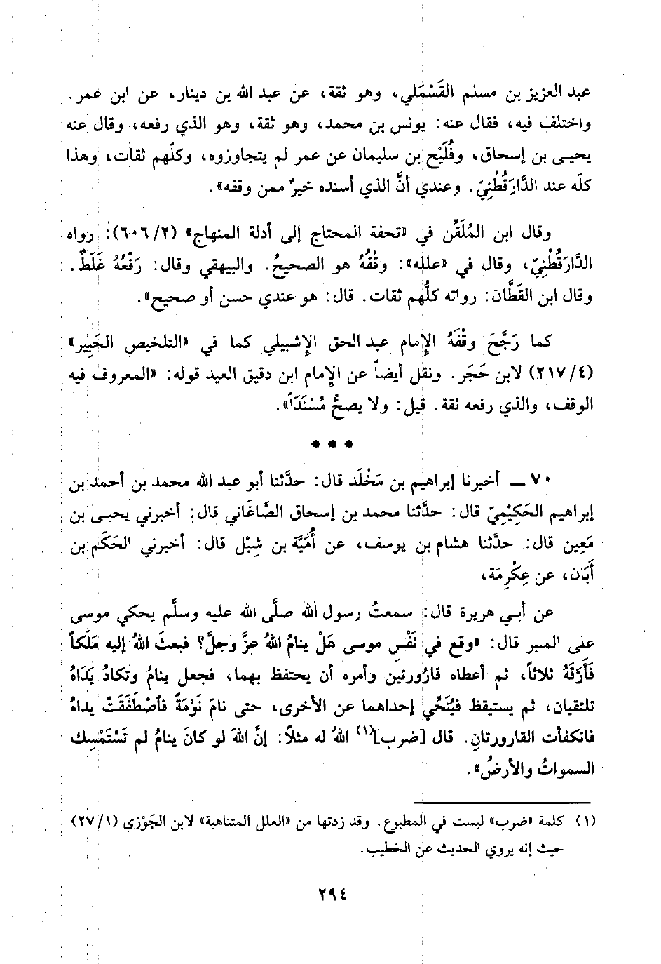 عبد العزيز بن مسلم القَسْمَلي، وهو ثقة، عن عبد اللَّه بن دينار، عن ابن عمر. واختلف فيه، فقال عنه: يونس بن محمد، وهو ثقة، وهو الذي رفعه،. وقال عنه يحيى بن إسحاق، وفُلَيْح بن سليمان عن عمر لم يتجاوزوه، وكلّهم ثقات، وهذا كلّه عند الدَّارَقُطْنِيّ. وعندي أنَّ الذي أسنده خيرٌ ممن وقفه".