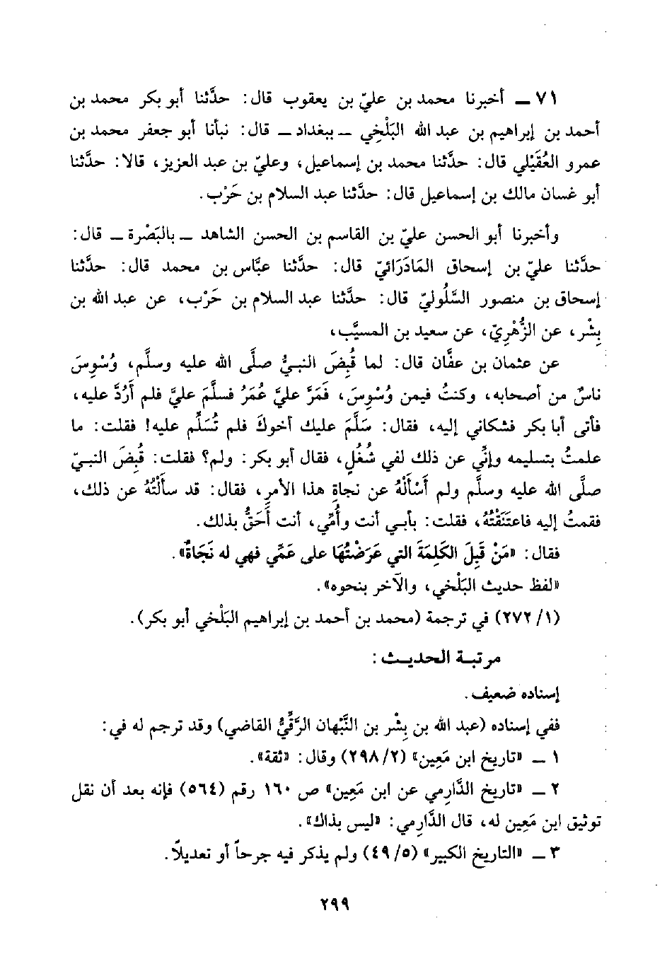 ٧١ - أخبرنا محمد بن عليّ بن يعقوب قال: حدَّثنا أبو بكر محمد بن أحمد بن إبراهيم بن عبد اللَّه البَلْخِي -ببغداد- قال: نبأنا أبو جعفر محمد بن عمرو العُقَيْلي قال: حدَّثنا محمد بن إسماعيل، وعليّ بن عبد العزيز، قالا: حدَّثنا أبو غسان مالك بن إسماعيل قال: حدَّثنا عبد السلام بن حَرْب.