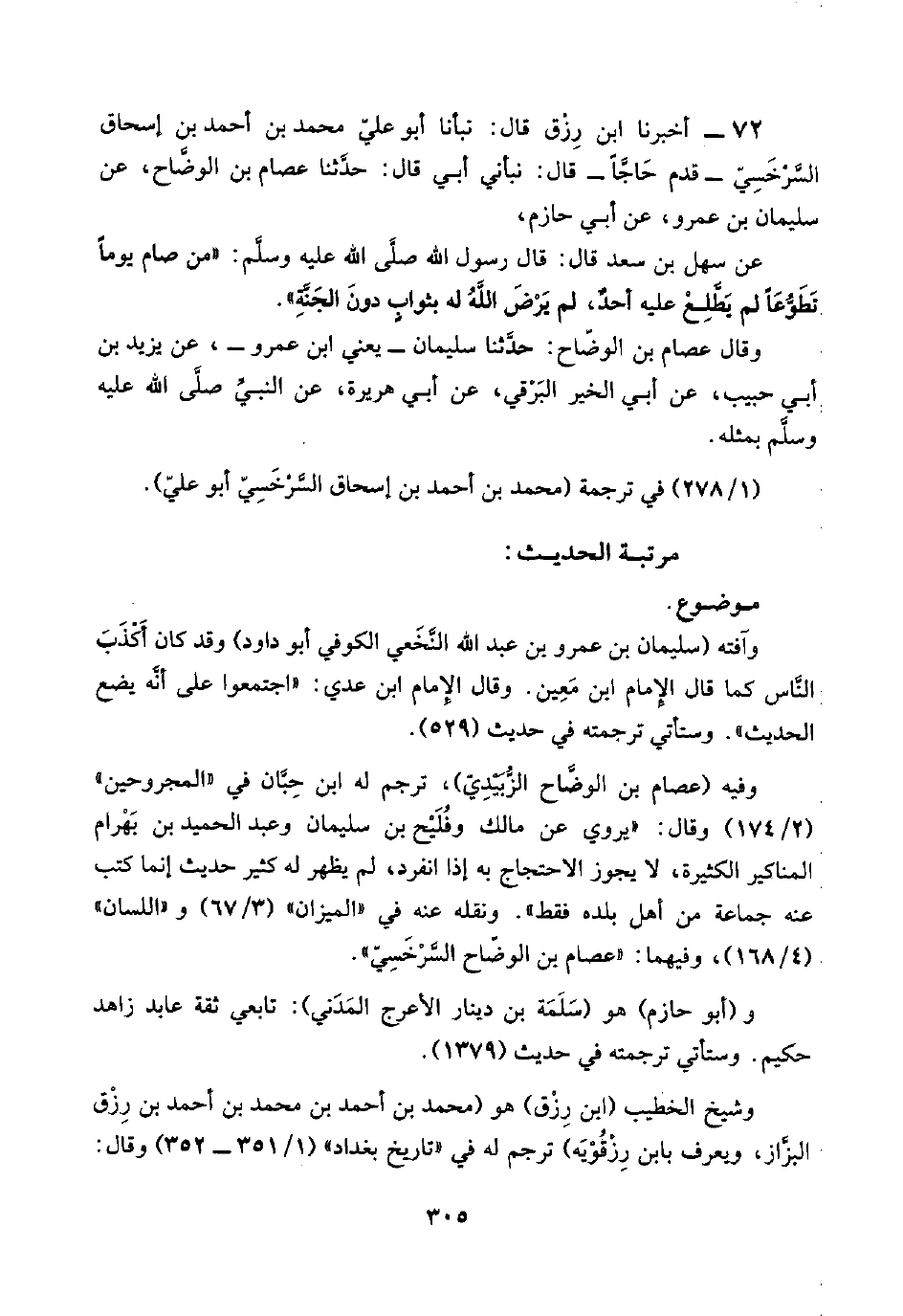٧٢ - أخبرنا ابن رِزْق قال: نبأنا أبو عليّ محمد بن أحمد بن إسحاق السَّرْخَسِيّ -قدم حَاجًّا- قال: نبأني أبي قال: حدَّثنا عصام بن الوضَّاح، عن سليمان بن عمرو، عن أبي حازم،