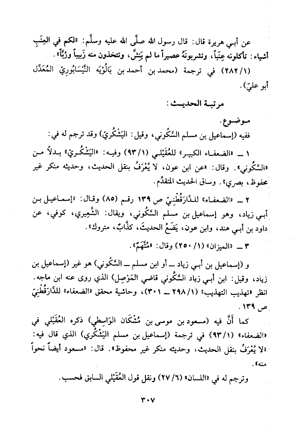 ٢ - "الضعفاء" للدَّارَقُطْنِيّ ص ١٣٩ رقم (٨٥) وقال: "إسماعيل بن أبي زياد، وهو إسماعيل بن مسلم السَّكُوني، ويقال: الشَّعِيري، كوفي، عن داود بن أبي هند، وابن عون، يَضَعُ الحديثَ، كذَّابٌ، متروك".