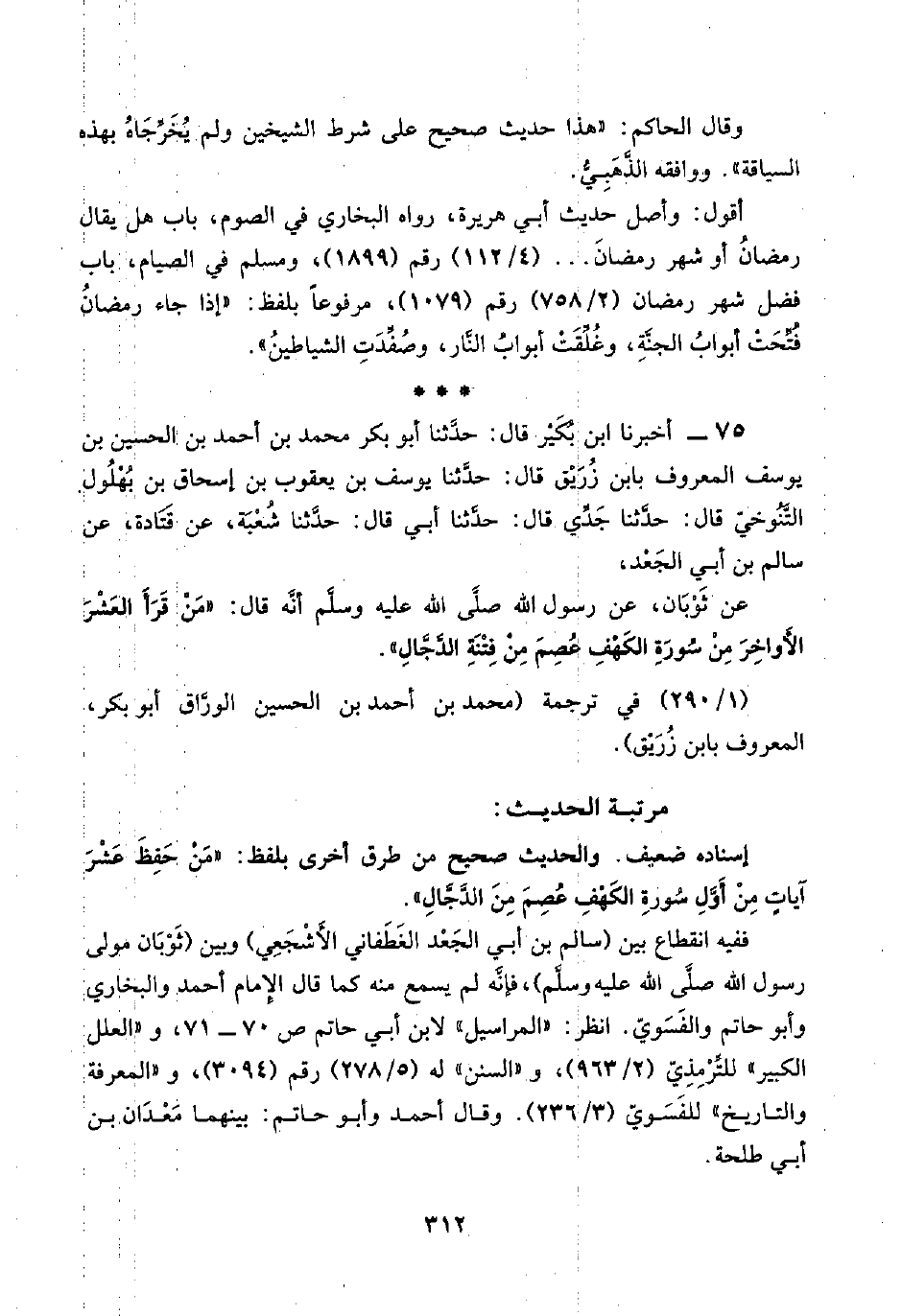 عن ثَوْبَان، عن رسول اللَّه صلَّى اللَّه عليه وسلَّم أنَّه قال: "مَنْ قَرَأَ العَشْرَ الأَواخِرَ مِنْ سُورَةِ الكَهْفِ عُصِمَ مِنْ فِتْنَةِ الدَّجَّالِ".