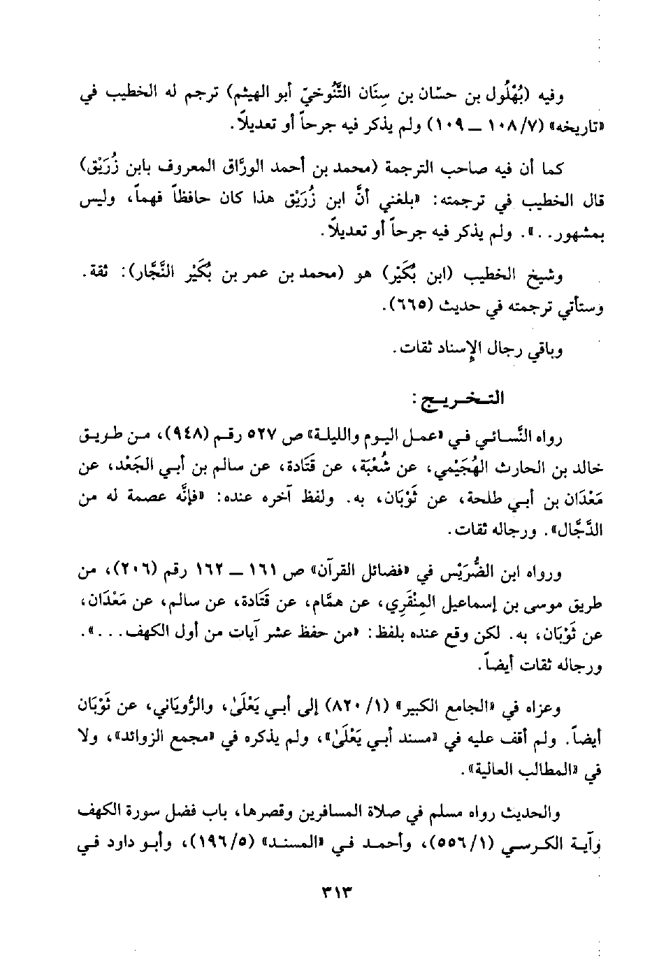 رواه النَّسائي في "عمل اليوم والليلة" ص ٥٢٧ رقم (٩٤٨)، من طريق خالد بن الحارث الهُجَيْمي، عن شُعْبَة، عن قَتَادة، عن سالم بن أبي الجَعْد، عن مَعْدَان بن أبي طلحة، عن ثَوْبَان، به. ولفظ أخره عنده: "فإنَّه عصمة له من الدَّجَّال". ورجاله ثقات.