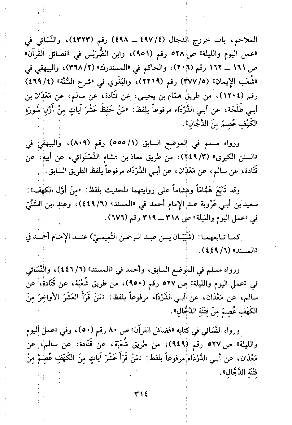 ورواه النَّسَائي في كتابه "فضائل القرآن" ص ٨٠ رقم (٥٠)، وفي "عمل اليوم والليلة" ص رقم (٩٤٩)، من طريق شُعْبَة، عن قَتَادة، عن سالم، عن مَعْدَان، عن أبي الدَّرْدَاء مرفوعًا بلفظ: "مَنْ قَرَأَ عَشْرَ آياتٍ مِنَ الكَهْفِ عُصِمَ مِنَ فِتْنَةِ الدَّجَّالِ".