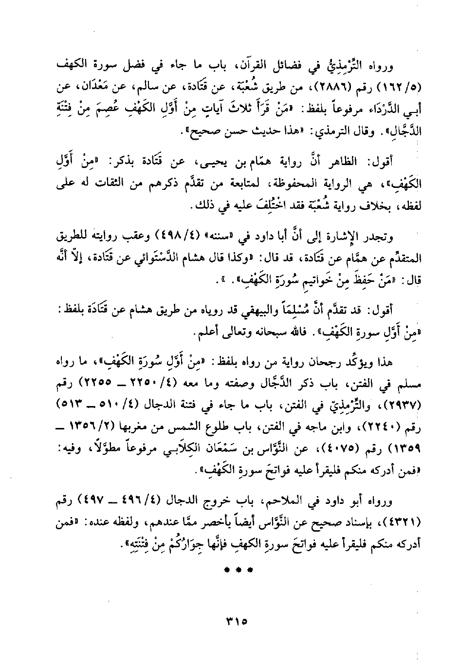ورواه التِّرْمِذِيُّ في فضائل القرآن، باب ما جاء في فضل سورة الكهف (٥/ ١٦٢) رقم (٢٨٨٦)، من طريق شُعْبَة، عن قَتَادة، عن سالم، عن مَعْدَان، عن أبي الدَّرْدَاء مرفوعًا بلفظ: "مَنْ قَرَأَ ثلاثَ آياتٍ مِنْ أَوَّلِ الكَهْفِ عُصِمَ مِنْ فِتْنَةِ الدَّجَّال". وقال التِّرْمِذِيّ: "هذا حديث حسن صحيح".