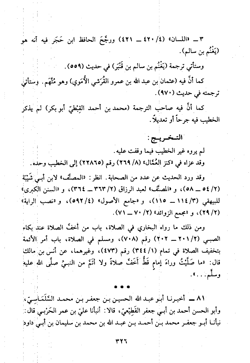 ٨١ - أخبرنا أبو عبد اللَّه الحسين بن جعفر بن محمد السَّلَمَاسِيّ، وأبو الحسن أحمد بن أبي جعفر القَطِيْعيّ، قالا: أنبأنا عليّ بن عمر الحَرْبي قال: نبأنا أبو جعفر محمد بن أحمد بن عبد اللَّه بن محمد بن سليمان بن أبي داود
