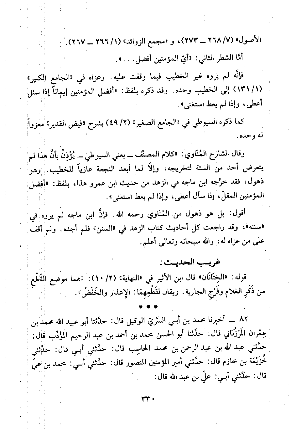 وقال الشارح المُنَاوي: "كلام المصنِّف -يعني السيوطي- يُؤْذِنُ بأنَّ هذا لم يتعرض أحد من الستة لتخريجه، وإلَّا لما أبعد النجعة عازيًا للخطيب. وهو ذهول، فقد خرَّجه ابن ماجه في الزهد من حديث ابن عمرو هذا، بلفظ: "أفضل المؤمنين المقلّ، إذا سأل أعطى، وإذا لم يعط استغنى".