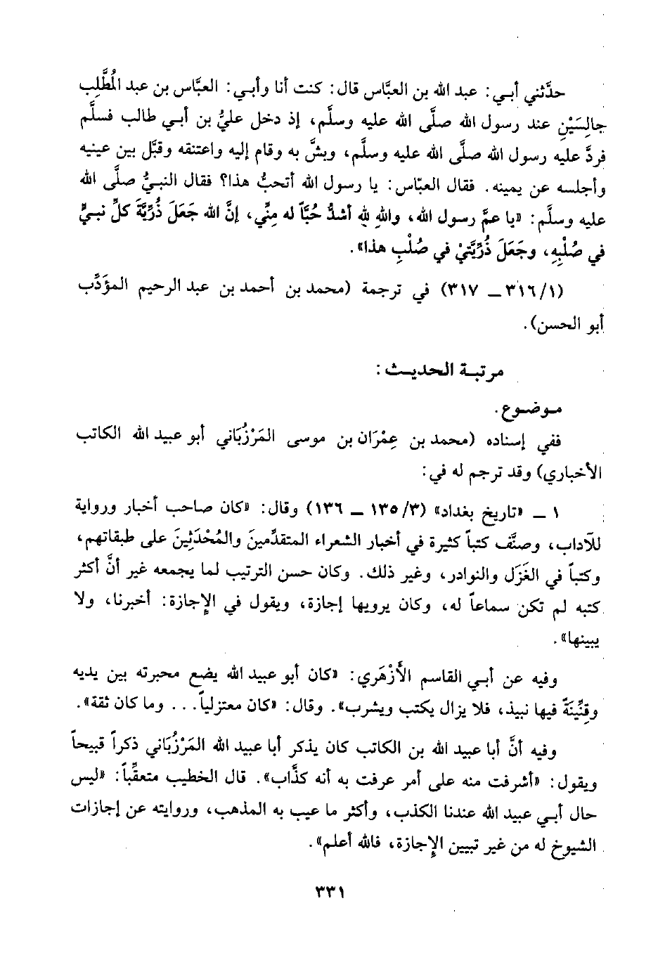 ففي إسناده (محمد بن عِمْرَان بن موسى المَرْزُبَاني أبو عبيد اللَّه الكاتب الأخباري) وقد ترجم له في: