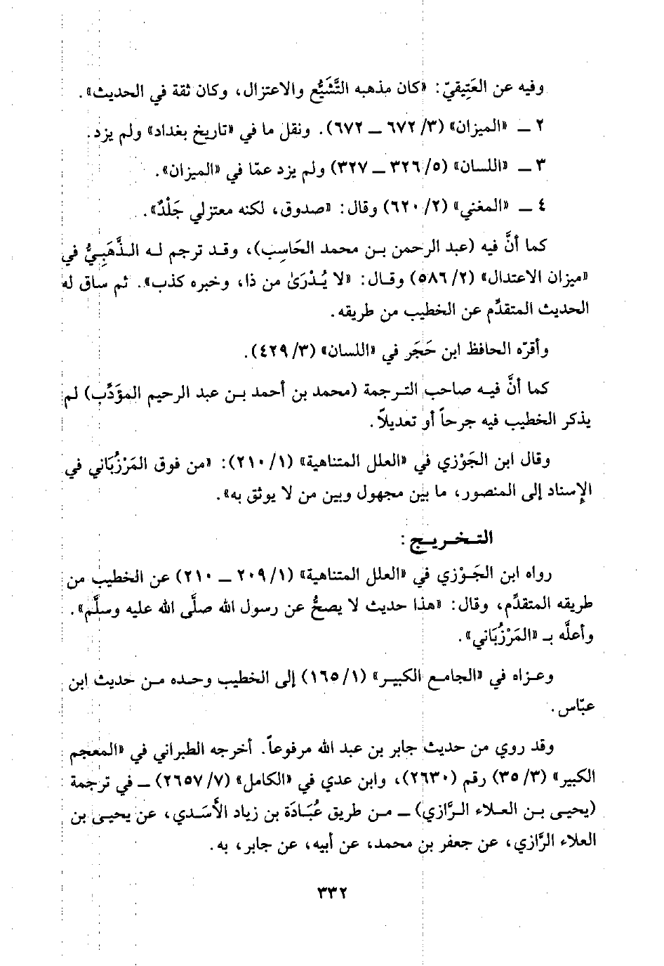 كما أنَّ فيه (عبد الرحمن بن محمد الحَاسِب)، وقد ترجم له الذَّهَبِيُّ في "ميزان الاعتدال" (٢/ ٥٨٦) وقال: "لا يُدْرَى من ذا، وخبره كذب". ثم ساق له الحديث المتقدِّم عن الخطيب من طريقه.
