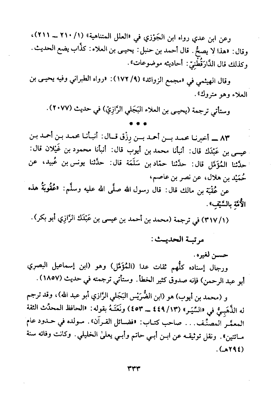 ٨٣ - أخبرنا محمد بن أحمد بن رِزْق قال: أنبأنا محمد بن أحمد بن عيسي بن عَبْدَك قال: أنبأنا محمد بن أيوب قال: أنبأنا محمود بن غَيْلان قال: حدَّثنا المُؤَمَّل قال: حدَّثنا حمَّاد بن سَلَمَة قال: حدَّثنا يونس بن عُبيد، عن حُمَيْد بن هلال، عن نصر بن عاصم،
