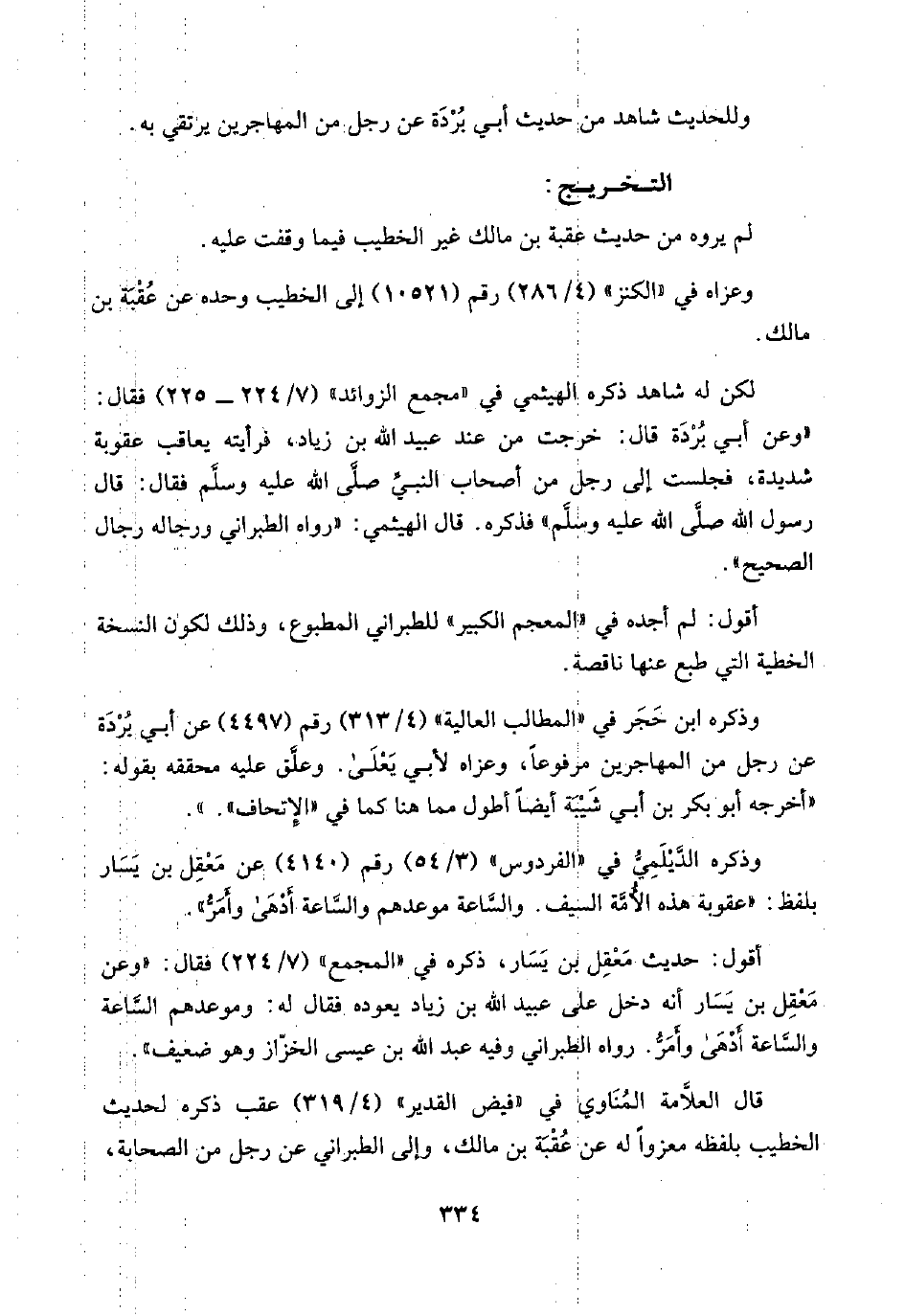قال العلّامة المُنَاوي في "فيض القدير" (٤/ ٣١٩) عقب ذكره لحديث الخطيب بلفظه معزوًا له عن عُقْبَة بن مالك، وإلى الطبراني عن رجل من الصحابة،