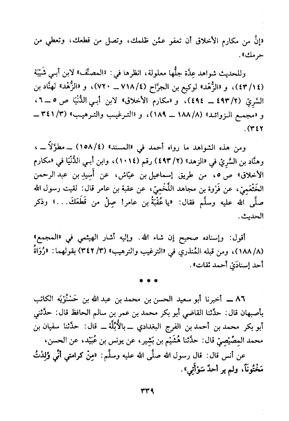 ومن هذه الشواهد ما رواه أحمد في "المسند" (٤/ ١٥٨) -مطوَّلًا-، وهنَّاد بن السَّرِيّ في "الزهد" (٢/ ٤٩٣) رقم (١٠١٤)، وابن أبي الدُّنيا في "مكارم الأخلاق" ص ٥، من طريق إسماعيل بن عيَّاش، عن أَسِيد بن عبد الرحمن الخَثْعَمِيّ، عن فَرْوة بن مجاهد اللَّخْمِيّ، عن عقبة بن عامر قال: لقيت رسول اللَّه صلَّى اللَّه عليه وسلَّم فقال: "يا عُقْبَةُ بن عامر! صِلْ من قَطَعَكَ. . . " وذكر الحديث.