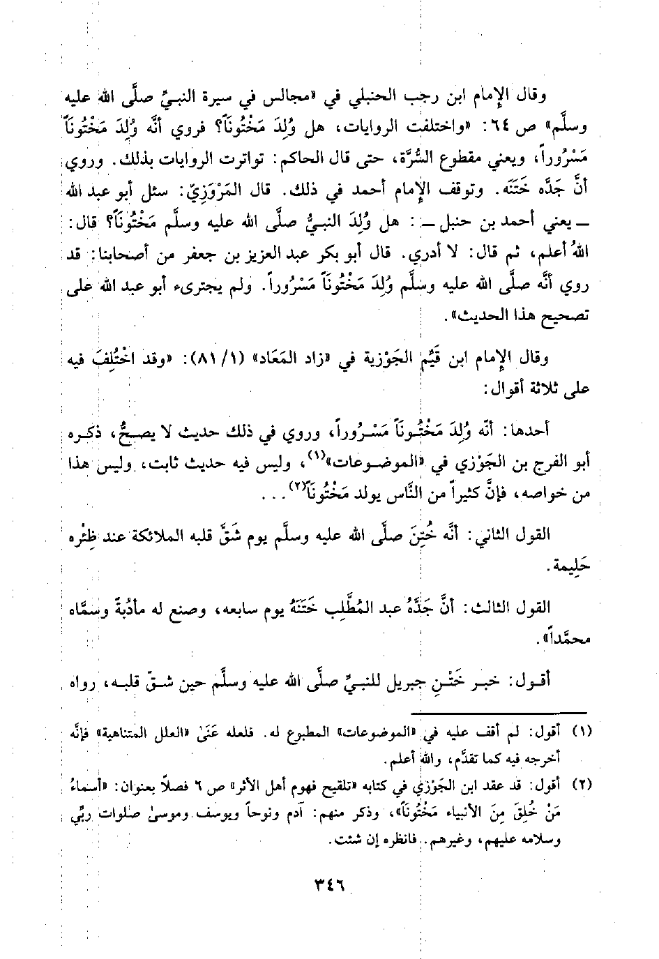 وقال الإِمام ابن رجب الحنبلي في "مجالس في سيرة النبيِّ صلَّى اللَّه عليه وسلَّم" ص ٦٤: "واختلفت الروايات، هل وُلِدَ مَخْتُونًا؟ فروي أنَّه ولد مَخْتُونًا مَسْرُورًا، ويعني مقطوع السُّرَّة، حتَّى قال الحاكم: تواترت الروايات بذلك. وروي أنَّ جَدِّه خَتَنَه. وتوقف الإِمام أحمد في ذلك. قال المَرْوَزِيّ: سئل أبو عبد اللَّه -يعني أحمد بن حنبل-: هل وُلِدَ النبيُّ صلَّى اللَّه عليه وسلَّم مَخْتُونًا؟ قال: اللَّهُ أعلم، ثم قال: لا أدري. قال أبو بكر عبد العزيز بن جعفر من أصحابنا: قد روي أنَّه صلَّى اللَّه عليه وسلَّم وُلِدَ مَخْتُونًا مَسْرُورًا. ولم يجترئ أبو عبد اللَّه على تصحيح هذا الحديث".