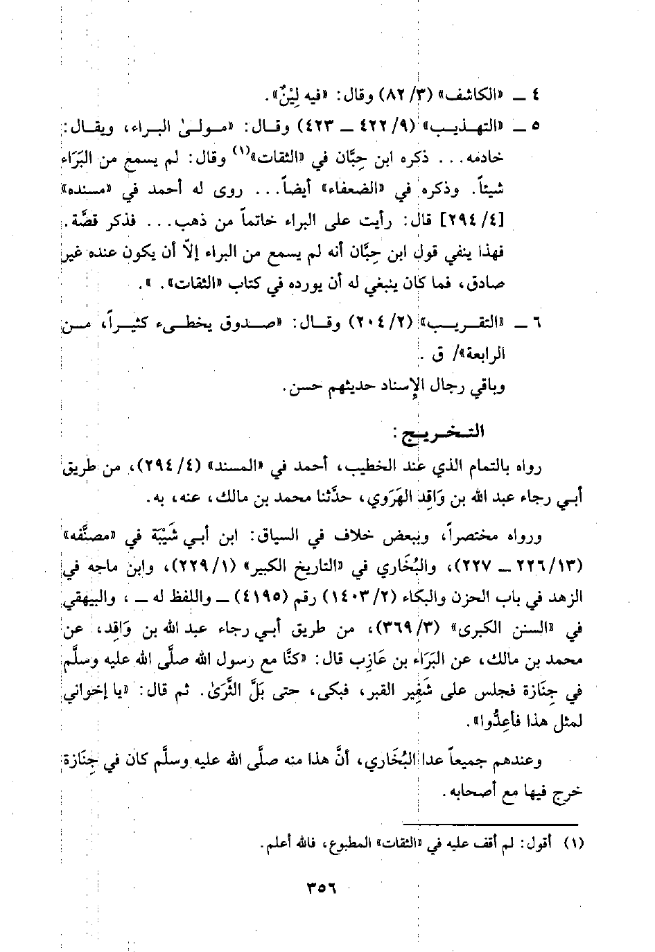 ٥ - "التهذيب" (٩/ ٤٢٢ - ٤٢٣) وقال: "مولى البراء، ويقال: خادمه. . . ذكره ابن حِبَّان في "الثقات" (¬١) وقال: لم يسمع من البَرَاء شيئًا. وذكره في "الضعفاء" أيضًا. . . روي له أحمد في "مسنده" [٤/ ٢٩٤] قال: رأيت على البراء خاتمًا من ذهب. . . فذكر قصَّة. فهذا ينفي قول ابن حِبَّان أنه لم يسمع من البراء إلَّا أن يكون عنده غير صادق، فما كان ينبغي له أن يورده في كتاب "الثقات".".