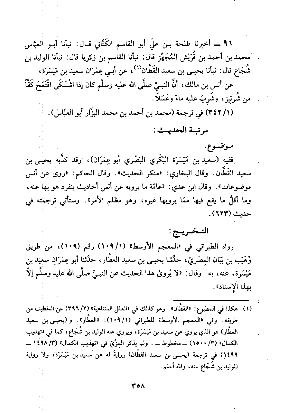 ٩١ - أخبرنا طلحة بن عليّ أبو القاسم الكَتَّاني قال: نبأنا أبو العبَّاس محمد بن أحمد بن قُرَيْش المُجَهِّز قال: نبأنا القاسم بن زكريا قال: نبأنا الوليد بن شُجَاع قال: نبأنا يحيى بن سعيد القَطَّان (¬١)، عن أبي عِمْرَان سعيد بن مَيْسَرَة،