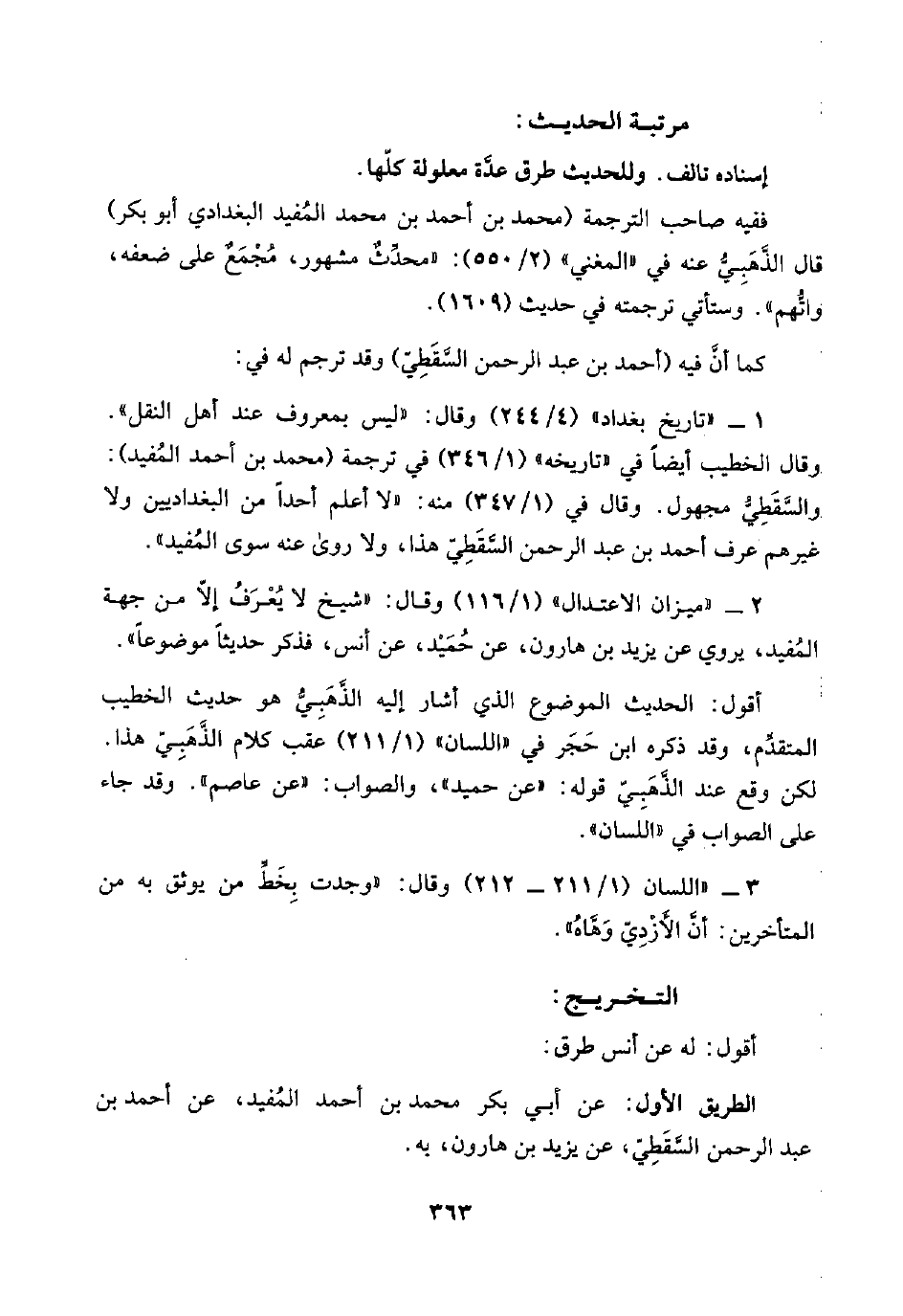 ٢ - "ميزان الاعتدال" (١/ ١١٦) وقال: "شيخ لا يُعْرَفُ إلّا من جهة المُفيد، يروي عن يزيد بن هارون، عن حُمَيْد، عن أنس، فذكر حديثًا موضوعًا".