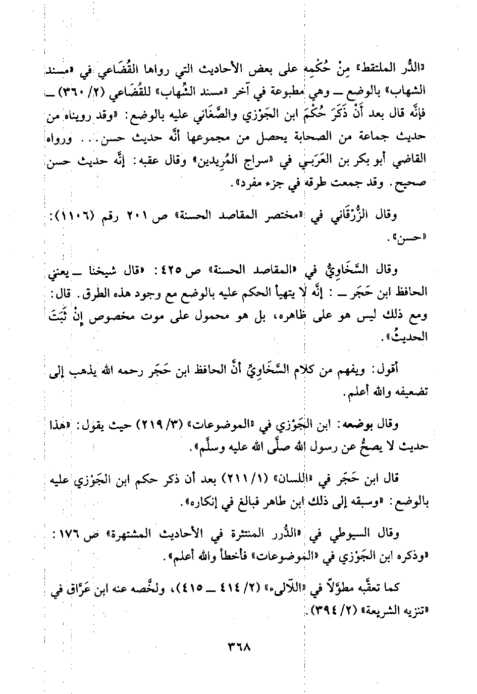 "الدُّر الملتقط" مِنْ حُكْمِه على بعض الأحاديث التي رواها القُضَاعي في "مسند الشهاب" بالوضع -وهي مطبوعة في آخر "مسند الشِّهاب" للقُضَاعي (٢/ ٣٦٠) - فإنَّه قال بعد أَنْ ذَكَرَ حُكْمَ ابن الجَوْزي والصَّغَاني عليه بالوضع: "وقد رويناه من حديث جماعة من الصحابة يحصل من مجموعها أنَّه حديث حسن. . . ورواه القاضي أبو بكر بن العَرَبي في "سراج المُرِيدين" وقال عقبه: إنَّه حديث حسن صحيح. وقد جمعت طرقه في جزء مفرد".