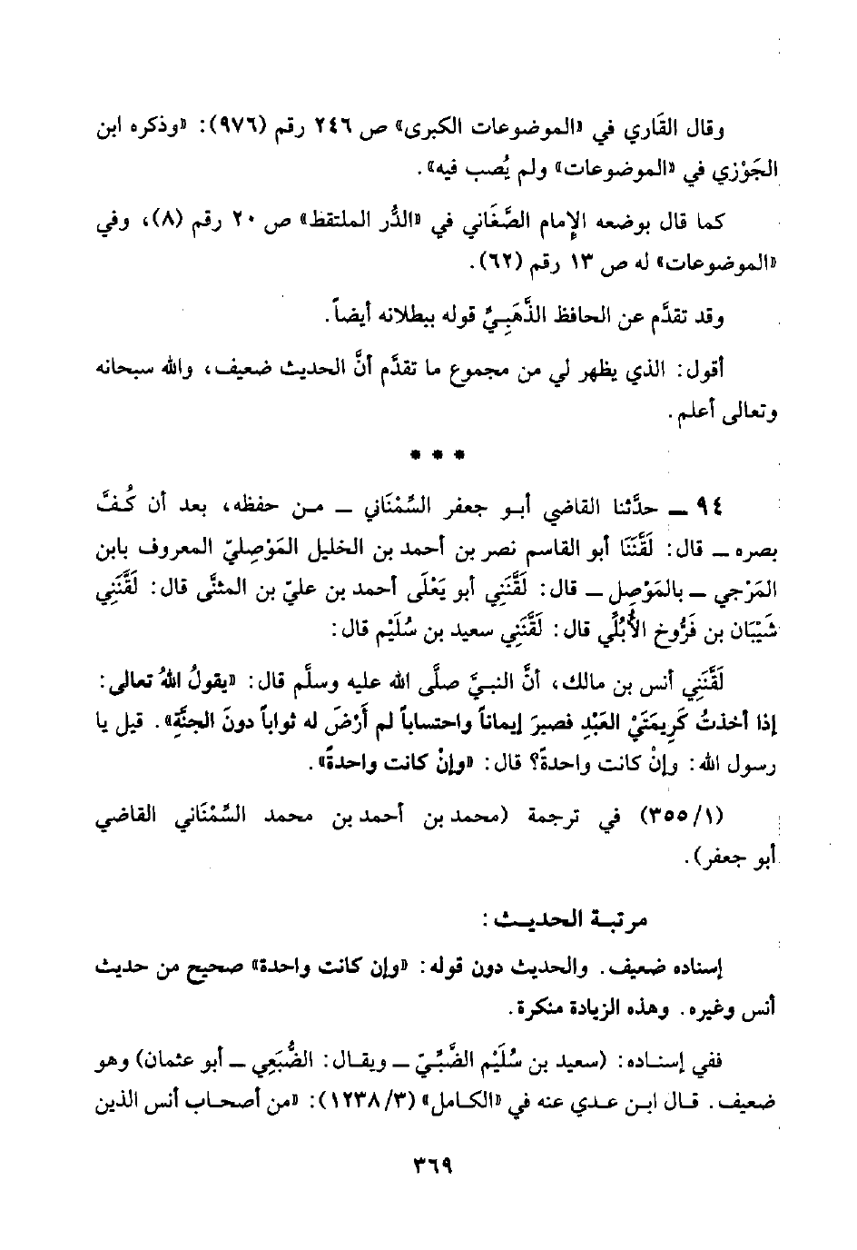 ٩٤ - حدَّثنا القاضي أبو جعفر السِّمْنَاني -من حفظه، بعد أن كُفَّ بصره- قال: لَقَّنَنَا أبو القاسم نصر بن أحمد بن الخليل المَوْصِليّ المعروف بابن المَرْجي -بالمَوْصِل- قال: لَقَّنَنِي أبو يَعْلَى أحمد بن عليّ بن المثنَّى قال: لَقَّنَنِي شَيْبَان بن فَرُّوخ الأُبُلِّي قال: لَقَّنَنِي سعيد بن سُلَيْم قال: