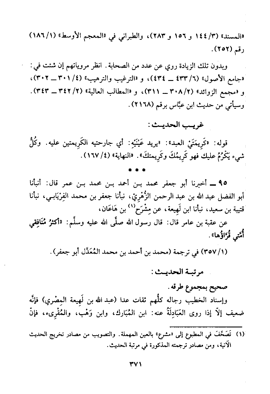 ٩٥ - أخبرنا أبو جعفر محمد بن أحمد بن محمد بن عمر قال: أنبأنا أبو الفضل عبد اللَّه بن عبد الرحمن الزُّهْرِيّ، نبأنا جعفر بن محمد الفِرْيَابي، نبأنا قتيبة بن سعيد، نبأنا ابن لَهِيعة، عن مِشْرَح (¬١) بن هَاعَان،