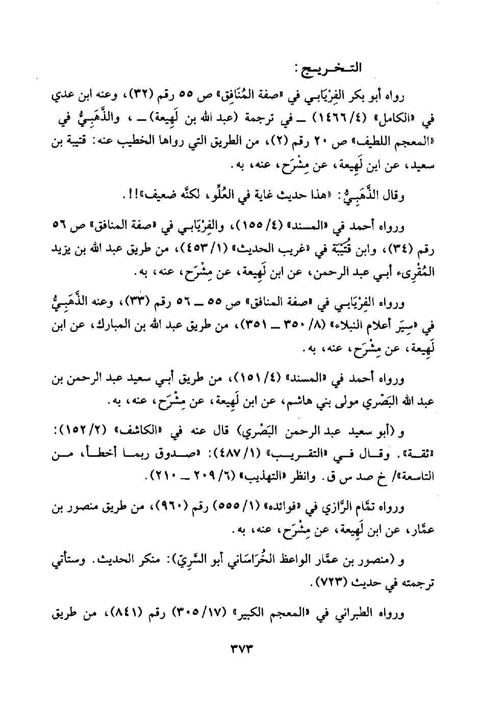 التخريج: رواه أبو بكر الفِرْيَابي في "صفة المُنَافِق" ص ٥٥ رقم (٣٢)، وعنه ابن عدي في "الكامل" (٤/ ١٤٦٦) -في ترجمة (عبد اللَّه بن لَهِيعة) -، والذَّهَبِيُّ في "المعجم اللطيف" ص ٢٠ رقم (٢)، من الطريق التي رواها الخطيب عنه: قتيبة بن سعيد، عن ابن لَهِيعة، عن مِشْرَح، عنه، به.