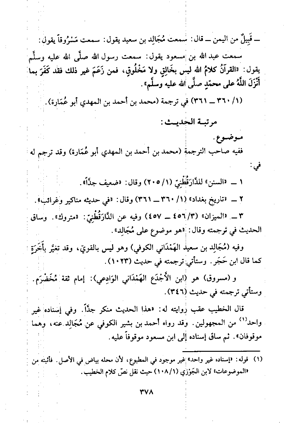 وفيه (مُجَالِد بن سعيد الهَمْدَاني الكوفي) وهو ليس بالقويّ، وقد تغيَّر بأَخَرَةٍ كما قال ابن حَجَر. وستأتي ترجمته في حديث (١٠٢٣).
