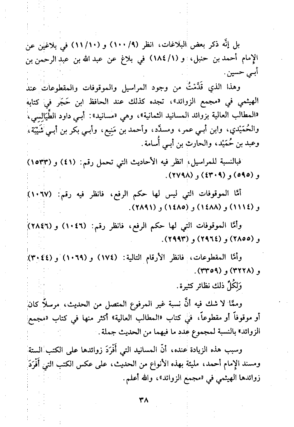 وممَّا لا شك فيه أنَّ نسبة غير المرفوع المتصل من الحديث، مرسلًا كان أو موقوفًا أو مقطوعًا، في كتاب "المطالب العالية" أكثر منها في كتاب "مجمع الزوائد" بالنسبة لمجموع عدد ما فيهما من الحديث جملة.