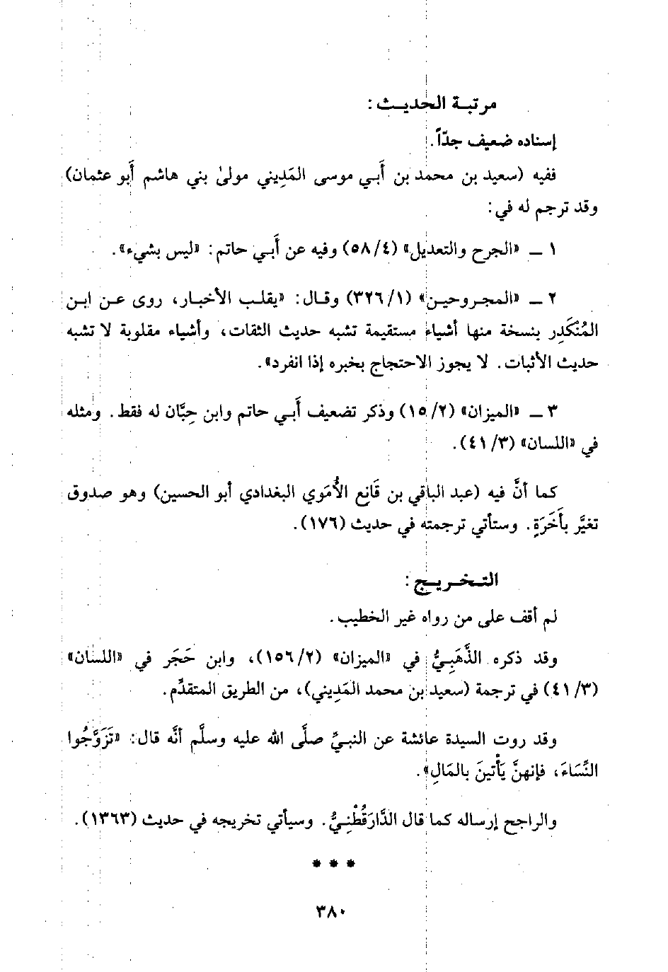 ٣ - "الميزان" (٢/ ١٥) وذكر تضعيف أَبي حاتم وابن حِبَّان له فقط. ومثله في "اللسان" (٣/ ٤١).