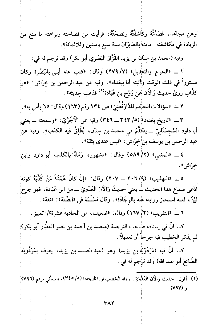 ٣ - "تاريخ بغداد" (٥/ ٣٤٣ - ٣٤٦) وفيه عن الآجُرِّيّ: "وسمعته -يعني أبا داود السِّجِسْتَانِيّ- يتكلَّمُ في محمد بن سِنَان، يُطْلِقُ فيه الكذب". وفيه عن عبد الرحمن بن يوسف بن خِرَاش: "ليس عندي بثقة".