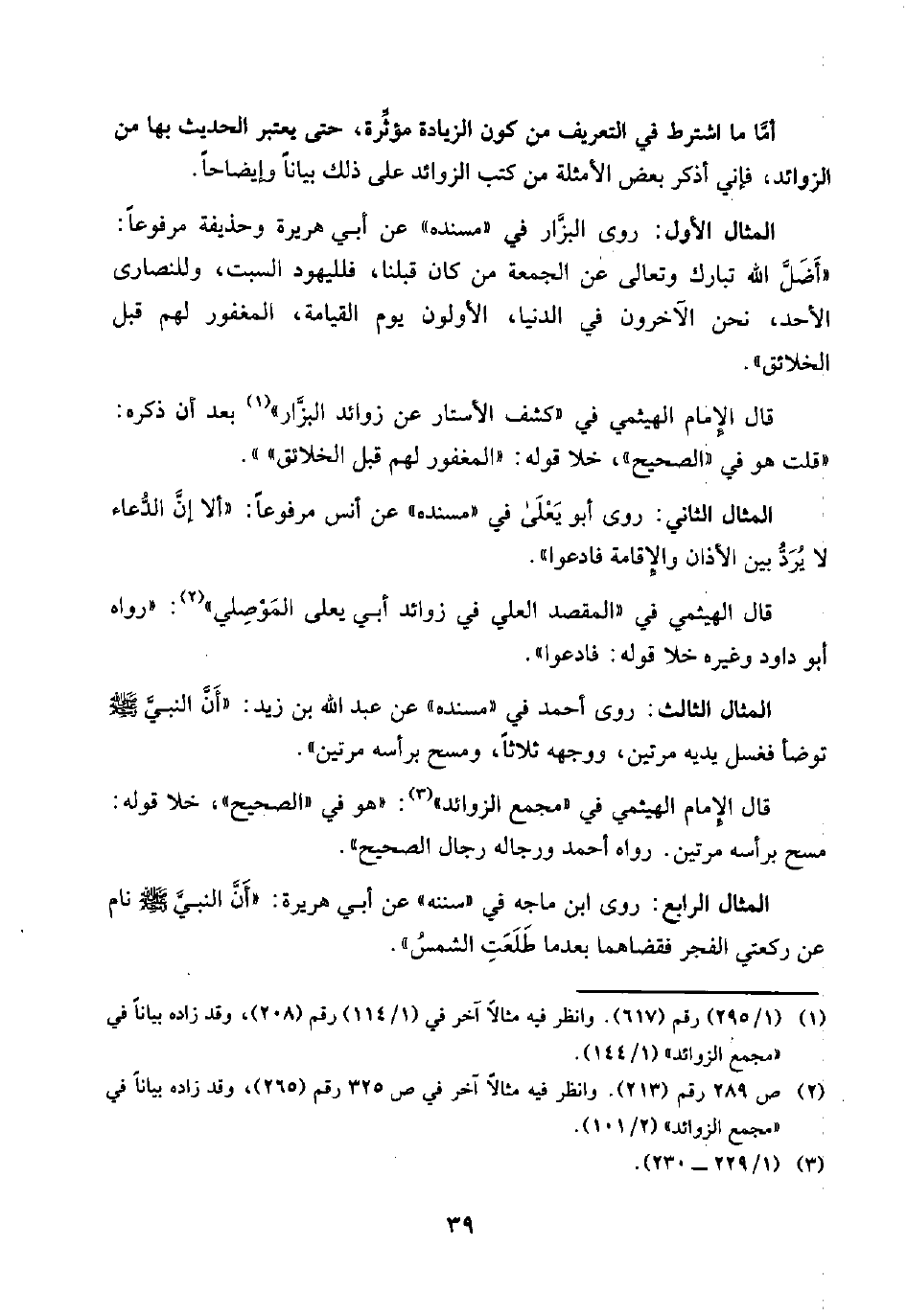 المثال الأول: روى البزَّار في "مسنده" عن أبي هريرة وحذيفة مرفوعًا: "أَضَلَّ اللَّه تبارك وتعالى عن الجمعة من كان قبلنا، فلليهود السبت، وللنصارى الأحد، نحن الآخرون في الدنيا، الأولون يوم القيامة، المغفور لهم قبل الخلائق".
