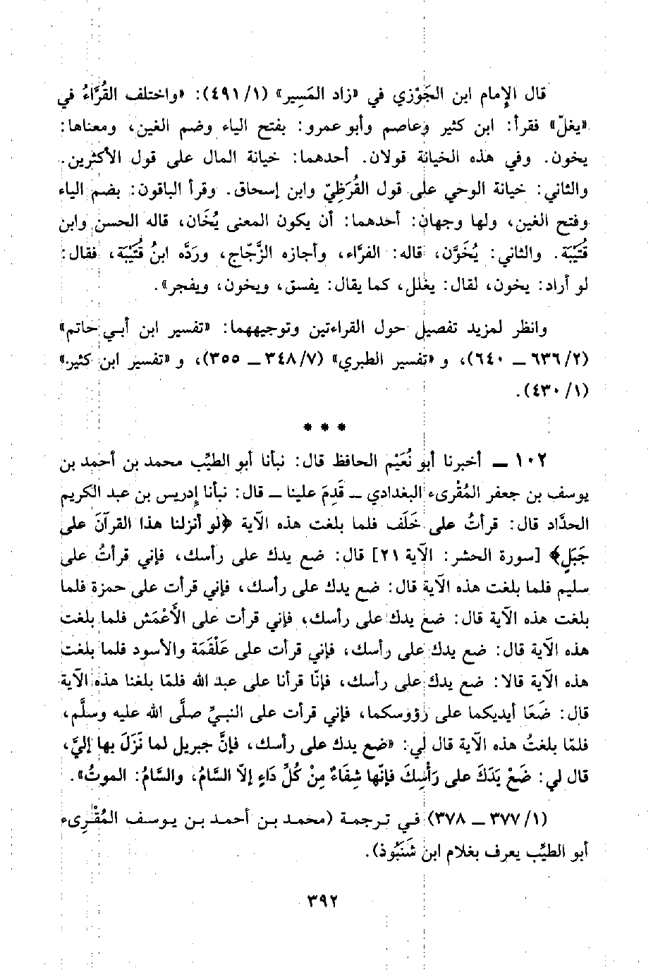 ١٠٢ - أخبرنا أبو نُعَيْم الحافظ قال: نبأنا أبو الطيِّب محمد بن أحمد بن يوسف بن جعفر المُقرئ البغدادي -قَدِمَ علينا- قال: نبأنا إدريس بن عبد الكريم الحدَّاد قال: قرأتُ على خَلَف فلما بلغت هذه الآية {لَوْ أَنْزَلْنَا هَذَا الْقُرْآنَ عَلَى جَبَلٍ} [سورة الحشر: الآية ٢١] قال: ضع يدك على رأسك، فإني قرأتُ على سليم فلما بلغت هذه الآية قال: ضع يدك على رأسك، فإني قرأت على حمزة فلما بلغت هذه الآية قال: ضع يدك على رأسك، فإني قرأت على الأَعْمَش فلما بلغت هذه الآية قال: ضع يدك على رأسك، فإني قرأت على عَلْقَمَة والأسود فلما بلغت هذه الآية قالا: ضع يدك على رأسك، فإنّا قرأنا على عبد اللَّه فلمّا بلغنا هذه الآية قال: ضَعَا أيديكما على رؤوسكما، فإني قرأت على النبيِّ صلَّى اللَّه عليه وسلَّم، فلمّا بلغتُ هذه الآية قال لي: "ضع يدك على رأسك، فإنَّ جبريل لما نَزَلَ بها إليَّ، قال لي: ضَعْ يَدَكَ على رَأْسِكَ فإنّها شِفَاءٌ من كُلِّ دَاءٍ إلّا السَّامُ، والسَّام: الموتُ".