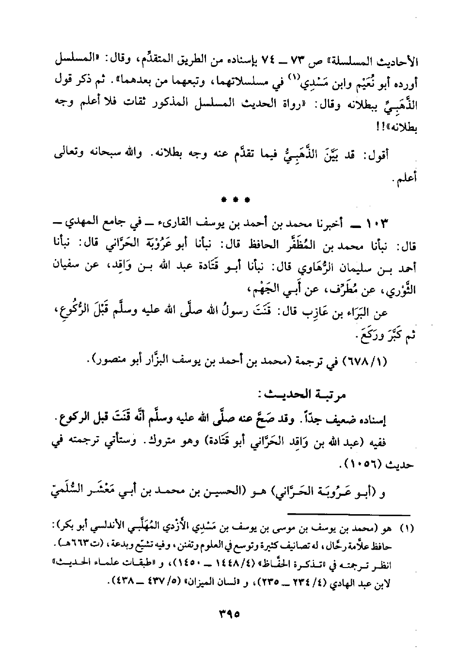 ١٠٣ - أخبرنا محمد بن أحمد بن يوسف القاريء -في جامع المهدي- قال: نبأنا محمد بن المُظَفَّر الحافظ قال: نبأنا أبو عَرُوْبَة الحَرَّاني قال: نبأنا أحمد بن سليمان الرُّهَاوي قال: نبأنا أبو قَتَادة عبد اللَّه بن وَاقِد، عن سفيان الثَّوْري، عن مُطَرِّف، عن أَبي الجَهْم،