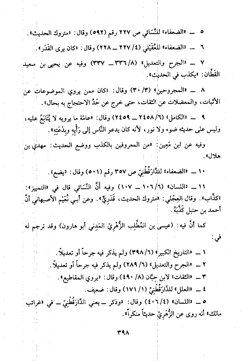 ١١ - "اللسان" (٦/ ١٠٦ - ١٠٧) وفيه أَنَّ النَّسَائي قال في "التمييز": "كذَّاب". وقال العِجْلي: "متروك الحديث، قَدَرِيٌّ". وعن أبي نُعَيْم الأصبهاني أنَّ أحمد بن حنبل كَذَّبَهُ.