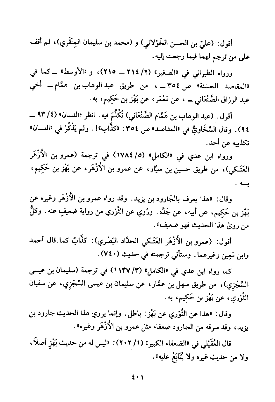 قال العُقَيْلي في "الضعفاء الكبير" (١/ ٢٠٢): "ليس له من حديث بَهْزٍ أصلًا، ولا من حديث غيره ولا يُتَابَعُ عليه".