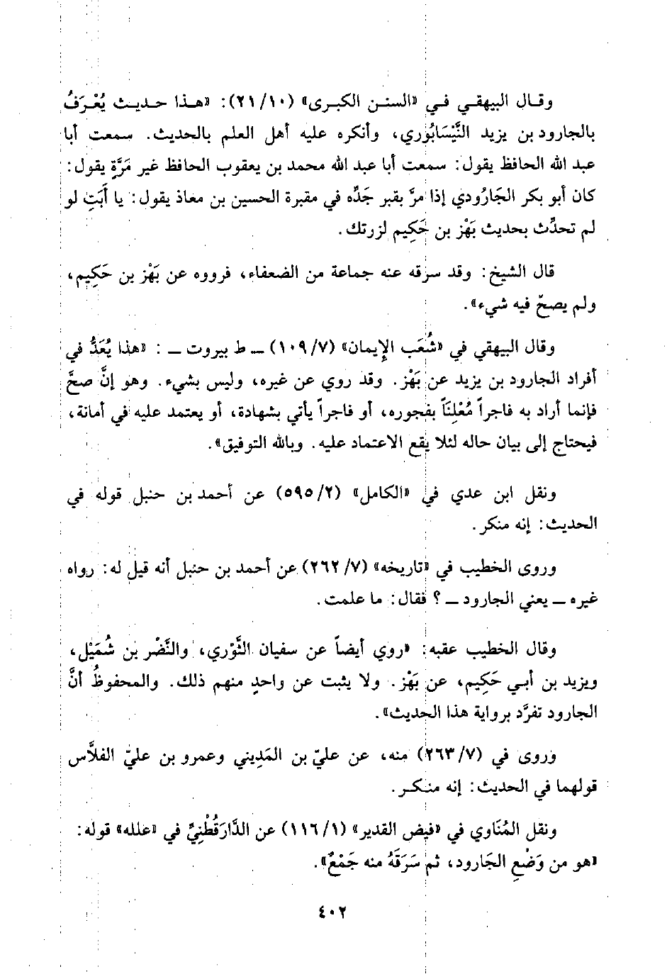 وقال الخطيب عقبه: "روي أيضًا عن سفيان الثَّوْري، والنَّضْر بن شُمَيْل، ويزيد بن أبي حَكِيم، عن بَهْز. ولا يثبت عن واحدٍ منهم ذلك. والمحفوظُ أنَّ الجارود تفرَّد برواية هذا الحديث".