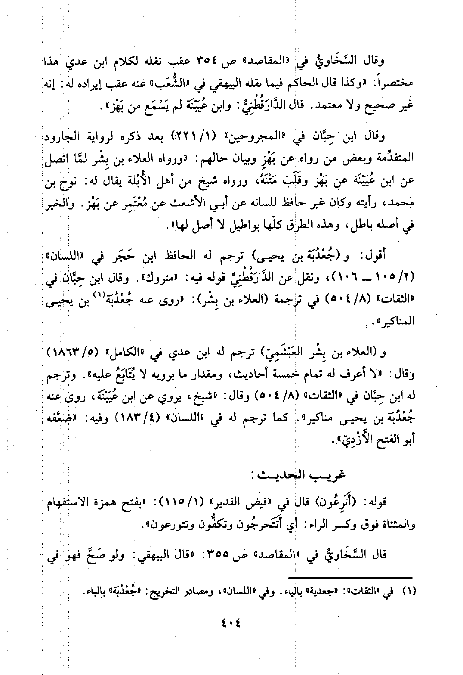 وقال السَّخَاويُّ في "المقاصد" ص ٣٥٤ عقب نقله لكلام ابن عدي هذا مختصرًا: "وكذا قال الحاكم فيما نقله البيهقي في "الشُّعَب" عنه عقب إيراده له: إنه غير صحيح ولا معتمد. قال الدَّارَقُطْنِيُّ: وابن عُيَيْنَة لم يَسْمَع من بَهْز".