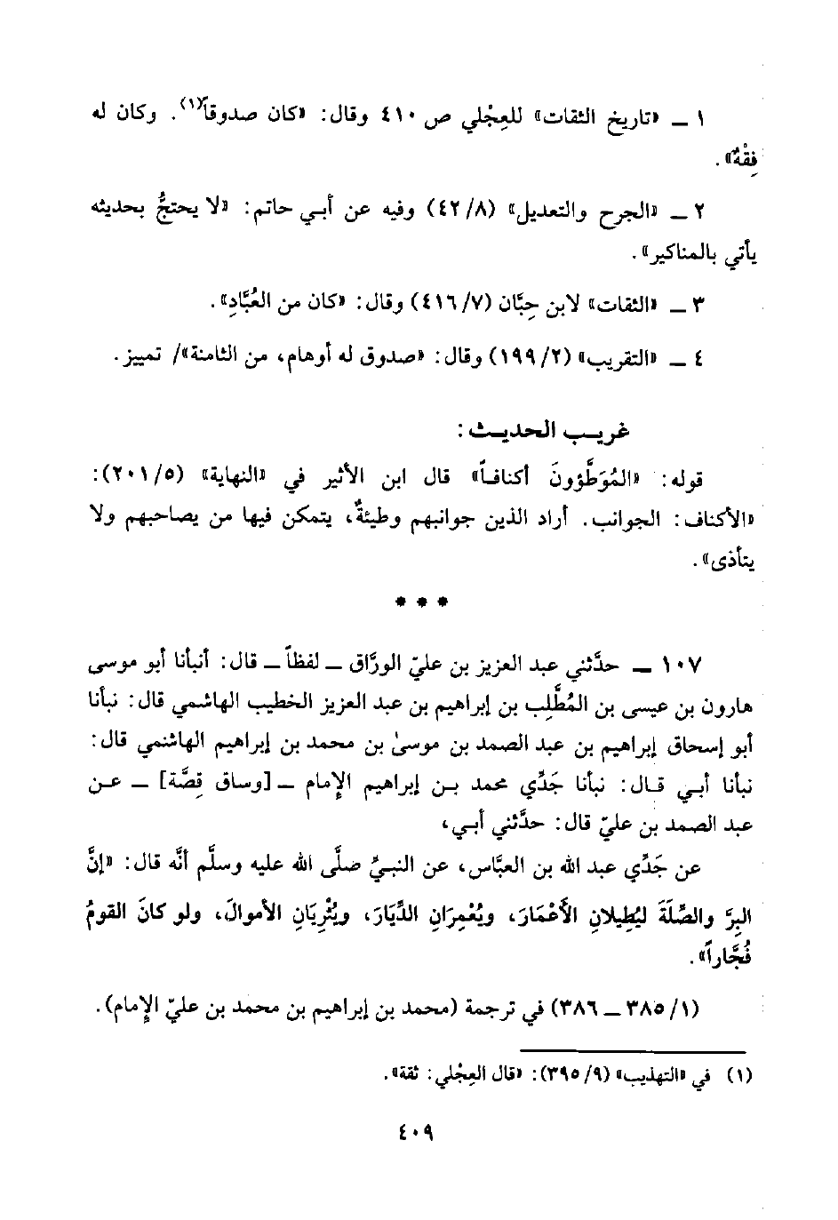 ١٠٧ - حدَّثني عبد العزيز بن عليّ الورَّاق -لفظًا- قال: أنبأنا أبو موسى هارون بن عيسى بن المُطَّلِب بن إبراهيم بن عبد العزيز الخطيب الهاشمي قال: نبأنا أبو إسحاق إبراهيم بن عبد الصمد بن موسى بن محمد بن إبراهيم الهاشمي قال: نبأنا أبي قال: نبأنا جَدِّي محمد بن إبراهيم الإِمام -[وساق قِصَّة]- عن عبد الصمد بن عليّ قال: حدَّثني أبي،