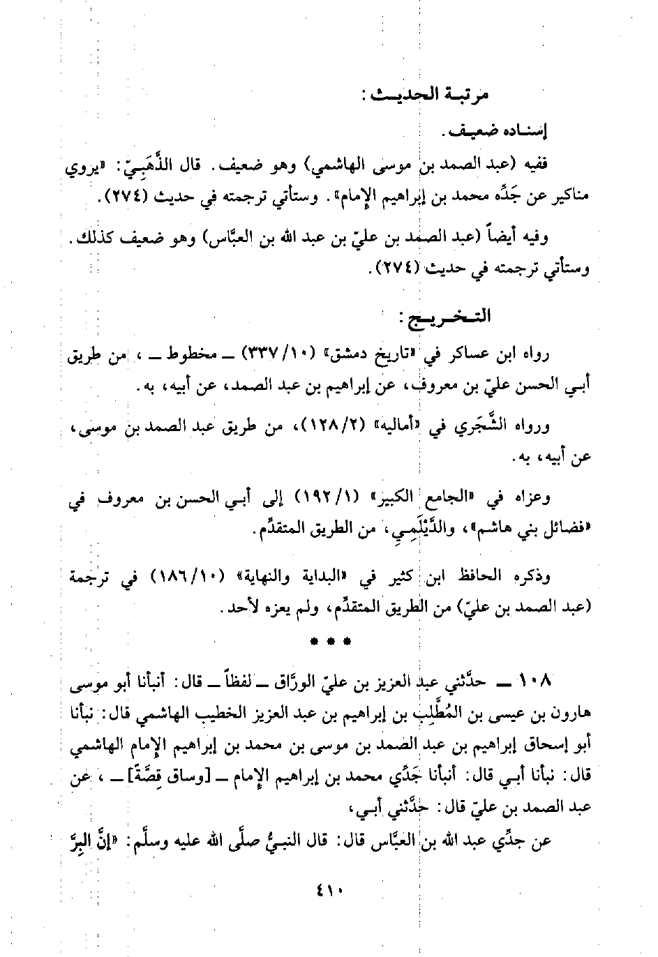 ١٠٨ - حدَّثني عبد العزيز بن عليّ الورَّاق -لفظًا- قال: أنبأنا أبو موسى هارون بن عيسى بن المُطَّلِب بن إبراهيم بن عبد العزيز الخطيب الهاشمي قال: نبأنا أبو إسحاق إبراهيم بن عبد الصمد بن موسى بن محمد بن إبراهيم الإِمام الهاشمي قال: نبأنا أبي قال: أنبأنا جَدِّي محمد بن إبراهيم الإمام -[وساق قِصَّةً]-، عن عبد الصمد بن عليّ قال: حدَّثني أبي،