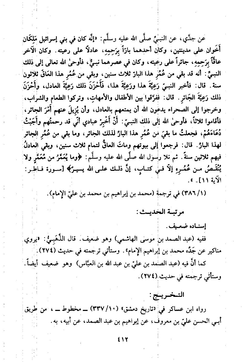عن جدَّي، عن النبيِّ صلى اللَّه عليه وسلَّم: "إنَّه كان في بني إسرائيل مَلِكَان أَخَوان على مدينتين، وكان أحدهما بارًّا بِرَحِمِهِ، عادلًا على رعيته. وكان الآخر عاقًّا بِرَحِمِهِ، جائرًا على رعيته، وكان في عصرهما نبيٌّ، فأوحى اللَّه تعالى إلى ذلك النبيِّ: أنه قد بقي من عُمُرِ هذا البارّ ثلاث سنين، وبقي من عُمُرِ هذا العَاقّ ثلاثون سنة. قال: فأخبر النبيّ رَعِيَّةَ هذا ورَعِيَّةَ هذا، فَأَخْزَنَ ذلك رَعِيَّةَ العادل، وأَخْزَنَ ذلك رَعِيَّةَ الجَائرِ. قال: ففرَّقوا بين الأطفال والأمهاتِ، وتركوا الطعام والشراب، وخرجوا إلى الصحراء يدعون اللَّه أن يمتعهم بالعادل، وأن يُزِيلَ عنهم أَمْرَ الجائر، فأقاموا ثلاثًا، فأوحى اللَّه إلى ذلك النبيّ: أَنْ أَخْبِرْ عبادي أنّي قد رحمتُهم وأَجَبْتُ دُعَاءَهُمْ، فجعلتُ ما بقيَ من عُمُرِ هذا البارِّ لذلك الجائر، وما بقي من عُمُرِ الجائر لهذا البارِّ. قال: فرجعوا إلى بيوتهم وماتَ العاقُّ لتمام ثلاث سنين، وبقي العادلُ فيهم ثلاثين سنةً. ثم تلا رسول اللَّه صلَّى اللَّه عليه وسلَّم: {وَمَا يُعَمَّرُ مِنْ مُعَمَّرٍ وَلَا يُنْقَصُ مِنْ عُمُرِهِ إِلَّا فِي كِتَابٍ إِنَّ ذَلِكَ عَلَى اللَّهِ يَسِيرٌ} [سورة فاطر: الآية ١١].".
